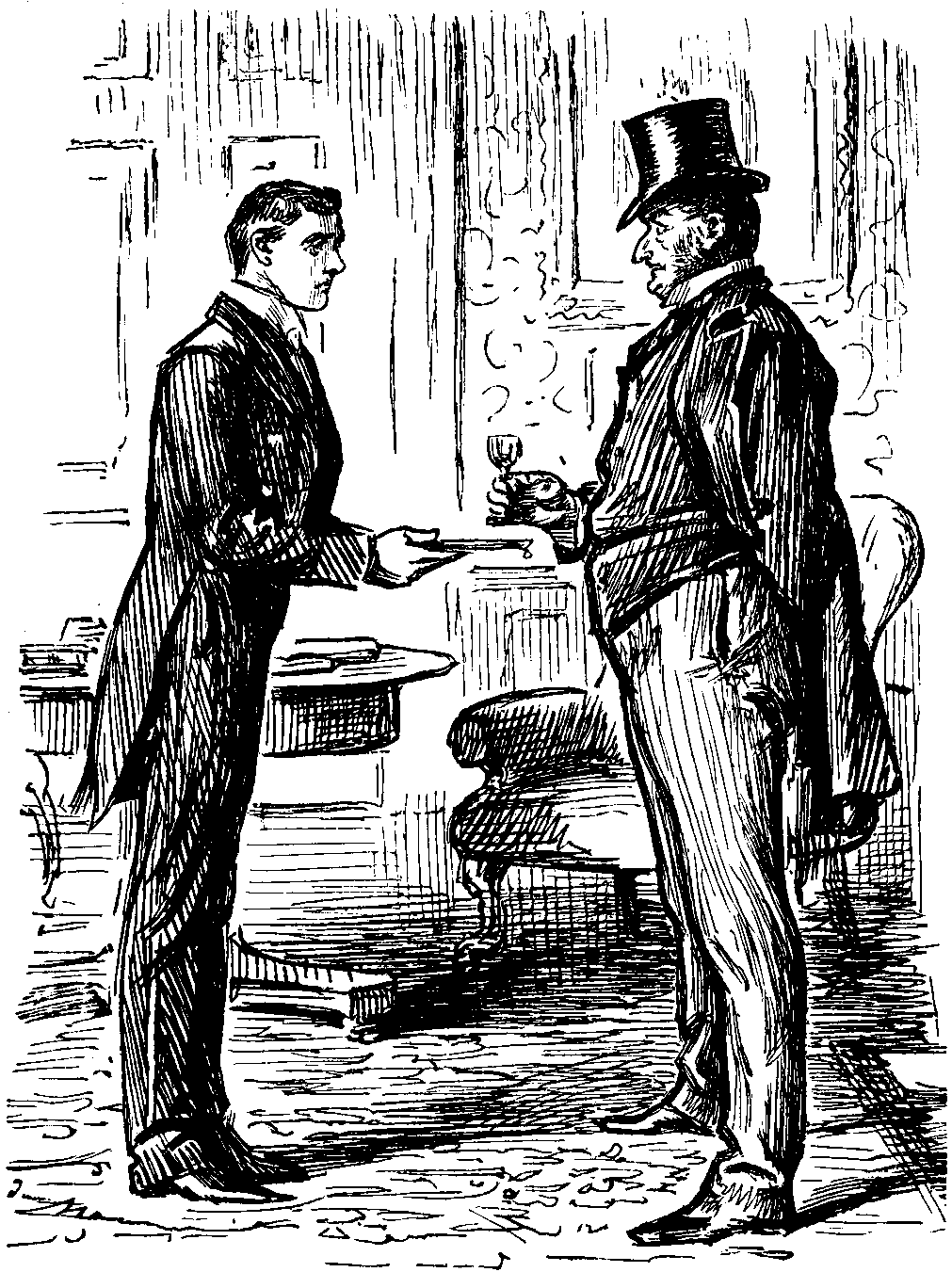 He wanted werry much to go to Brighton, and see our new Grand Metropole Otel opened last Satterday; so I spoke to our most gentlemanly Manager, and he gave him a ticket that took him down first-class, and brort him back, and took him into the Otel, and supplied him with heverythink as art coud wish for, or supply, and as much Shampane as he could posserbly drink—and, when there ain't nothink to pay for it, it's reelly estonishing what a quantity a gennelman can dispose of—; and the way in which he afterwards told me as he showed his grattitude for what he called a reel first-class heavening's enjoyment was, to engage a delicious little sweet of apartments for a fortnite, so we shall see him no more for that length of time. He told me as he had seen all the great Otels of Urope and Amerrykey, but he was obligated to confess, in his own emphatic langwidge, that the Brighton Metropole "licked all creation!" I didn't quite understand him, but I've no doubt it was intended as rayther complimentary. He rayther staggered me by asking what it cost, but I was reddy with my anser, and boldly said, jest exacly a quarter of a million.