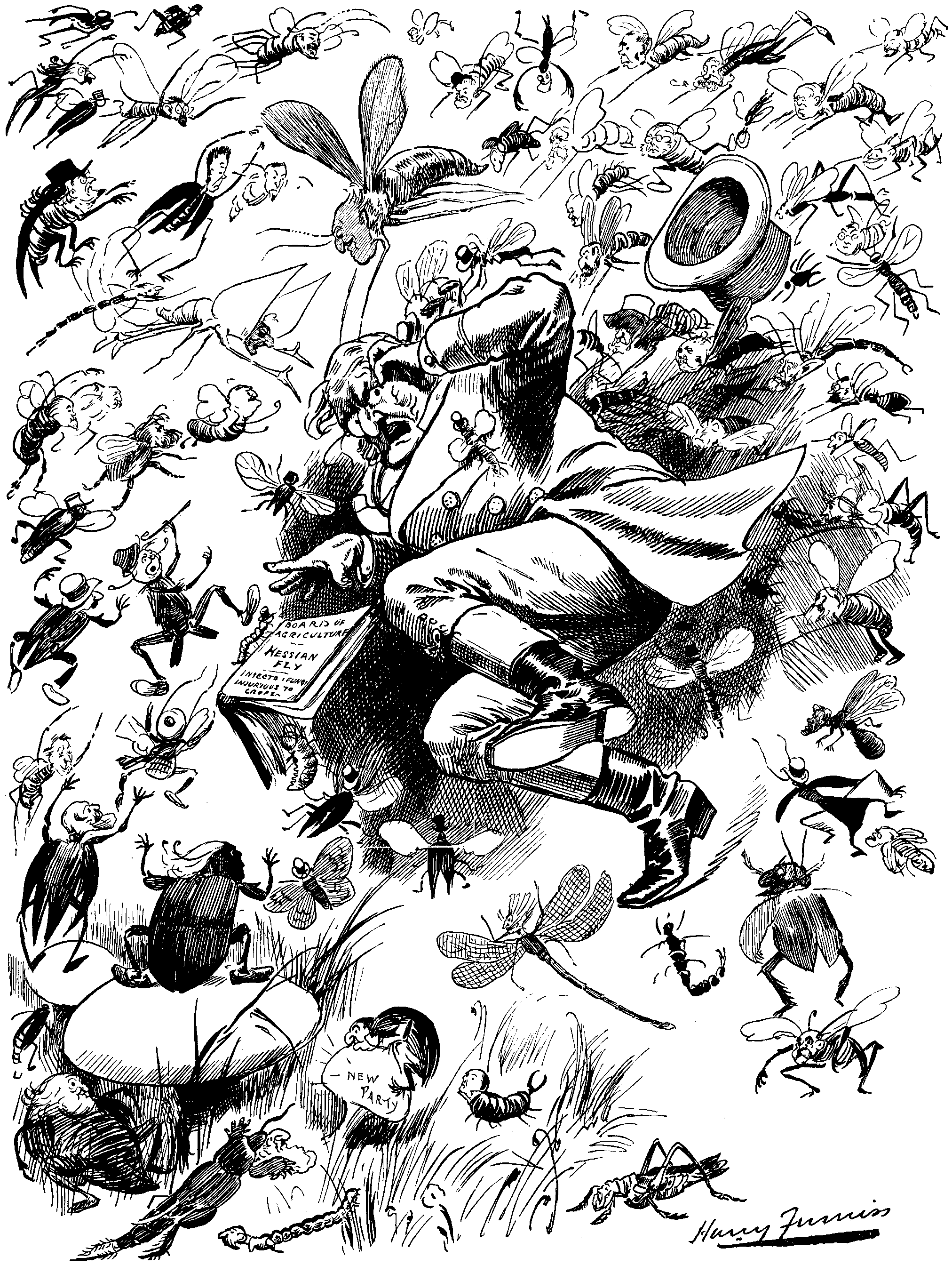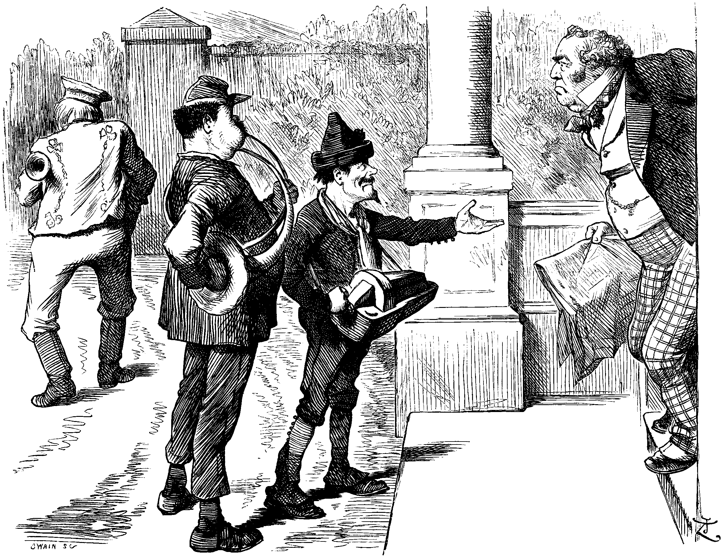 Well, all I can say is, that if I affords the heminent Amerrycane jest about harf the fun and emusement as he does me, I must be a much cleverer feller than I ewer thort myself, or than my better harf ewer told me as I was. Ah, wouldn't he jest make her stare a bit if she herd sum of his most owdacious sayings. Why, he acshally says, that the hole system of marrying for life is all a mistake, and not consistent with our changable nature! And that we ort to take our Wives on lease, as we does our houses, wiz., for sewen or fourteen years, and that in a great majority of cases they woud both be preshus glad when the end of the lease came! And he tries werry hard to make me bleeve, tho in course he doesn't succeed, that in one part of his grate and staggering Country, ewerybody does jest as he likes in these rayther himportant matters, and has jest as many Wives as he can afford to keep, and that the King of that place has about a dozen of 'em! Ah, if you wants to hear a reel downright staggerer as nobody carnt posserbly bleeve, don't "ask the Pleaceman," but arsk an Amerrycane!