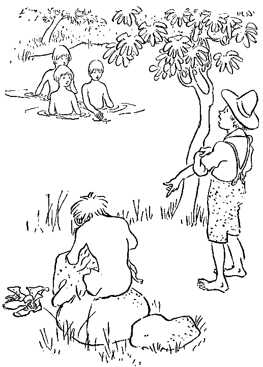 Then Piggy and Abe and Jimmy and Mealy came trapesing up to Miss Morgan's kitchen door. Bud sat by the tree twirling his knife at his game. Piggy, being the spokesman, stood in the doorway. "Miss Morgan," he said, as he slapped his leg with his hat.