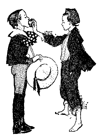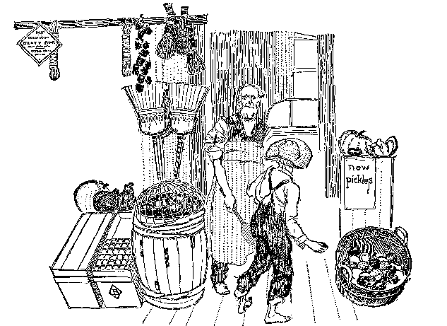 Mr. Pennington's glance at his son showed that Piggy was unharmed. A swift survey of the others gave each, save Bud, a bill of health. But when Mr. Pennington's eyes fell on Bud, he leaned on a show-case and laughed till he shook all over; for Bud, with a rimless hat upon a towselled head, with a face scratched till it looked like a railroad map, with a torn shirt that exposed a dirty shoulder and a freckled back, with trousers so badly shattered that two hands could hardly hold them together,—as Mr. Pennington expressed it, Bud looked like a second-hand boy. The simile pleased Pennington so that he renewed his laughter, and paid no heed to the chatter of the pack clamoring to tell all in one breath, the history of the incident that had led to Bud's dilapidation. Also they were drawing gloomy pictures of the appearance of his assailants, after the custom of boys in such cases. Because his son was not involved in the calamity, Piggy's father was not moved deeply by the story of the raid of the North-enders and their downfall. So he put the young gentlemen of the Court of Boyville into the back room of his grocery store, where coal-oil and molasses barrels and hams and bacon and black shadows of many mysterious things were gathered. He gave the royal party a cheese knife and a watermelon, and bade them be merry, a bidding which set the hearts of Piggy and Abe and Jimmy and Mealy to dancing, while Bud's heart, which had been sinking lower and lower into a quagmire of dread, beat on numbly and did not join the joy. As the time for going home approached, Bud shivered in his soul at the thought of meeting Miss Morgan. Not even the watermelon revived him, and when a watermelon will not help a boy his extremity is dire. Still he laughed and chatted with apparent merriment, but he knew how hollow was his laughter and what mockery was in his cheer. When the melon was eaten business took its regular order.
