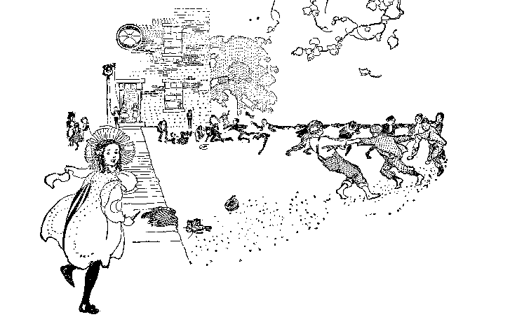 What passed in the ring as Bud left it, bedraggled and dusty, did not interest him. He brushed himself as he went. The band was playing madly, and the young woman in the stiff skirts was standing by her horse ready to mount. The crowd did not stop laughing; Bud inclined his head to dust his knickerbockers, and then in a tragic instant he saw what was convulsing the multitude with laughter. The outer seam of the right leg of his velveteen breeches was gone, and a brown leg was winking in and out from the flapping garment as he walked. Wildly he gathered the parted garment, and it seemed to him that he never would cover the ground between the ring and the benches. In the course of several æons—which the other boys measured by fleeting minutes—the wave of shame that covered Bud subsided. Pins bound up the wounds in his clothes. He drew a natural breath, and was able to join the mob which howled down the man who announced the concert.