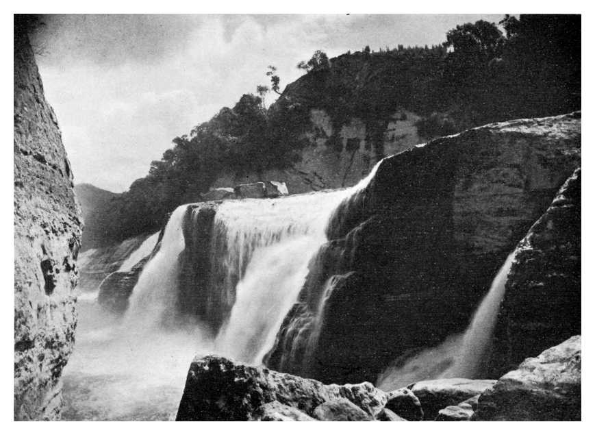 The extreme south and north of the North Island could hardly, by any stretch of imagination, be called rich and fertile. But the island demonstrates the "falsehood of extremes," for between them is found some of the finest and pleasantest land in the southern hemisphere. Nearly all of this, however, lies within fifty miles of one or other coast. When you have left these tracts, and have risen a thousand feet or so, you come to a volcanic plateau, clad for the most part in dark green and rusty bracken or tussocks of faded yellow. Right in the centre rise the great volcanoes, Ruapehu, Tongariro and Tarawera, majestic in their outlines, fascinating because of the restless fires within and the outbreaks which have been and will again take place. Scattered about this plateau are lakes of every shape and size, from Taupo—called Te Moana (the sea) by the Maoris—to the tiniest lakelets and ponds. Here are found pools and springs of every degree of heat. Some are boiling cauldrons into which the unwary fall now and again to meet a death terrible, yet—if the dying words of some of them may be believed—not always agonizing, so completely does the shock of contact with the boiling water kill the nervous system. Many pools are the colour of black broth. Foul with mud and sulphur, they seethe and splutter in their dark pits, sending up clouds of steam and sulphurous fumes. Others are of the clearest green or deepest, purest blue, through which thousands of silver bubbles shoot up to the surface, flash, and vanish. But the main use of the hot springs is found in their combination of certain chemical properties,—sulphur-acid, sulphur-alkaline. Nowhere in the world, probably, are found healing waters at once so powerful and so various in their uses. Generations ago the Maori tribes knew something of their effects. Now invalids come from far and near in hundreds and thousands, and when the distractions and appliances of the sanitary stations equal those of the European spas they will come in tens of thousands, for the plateau is not only a health-resort but a wonderland. Its geysers rank with those of Iceland and the Yellowstone. Seen in the clear sunny air, these columns of water and white foam, mounting, swaying, blown by the wind into silver spray, and with attendant rainbows glittering in the light, are sights which silence even the chattering tourist for a while. Solfataras, mud volcanoes and fumaroles are counted in hundreds in the volcanic zone. If there were not such curiosities, still the beauty of the mountains, lakes, streams and patches of forest would, with the bright invigorating air, make the holiday-maker seek them in numbers. Through the middle of this curious region runs the Waikato, the longest and on the whole most tranquil and useful of that excitable race the rivers of New Zealand. Even the Waikato has its adventures. In one spot it is suddenly compressed to a sixth of its breadth, and, boiling between walls of rock, leaps in one mass of blue water and white foam into a deep, tree-fringed pool below. This is the Huka Waterfall. It is but one of the many striking falls to be met with in the Islands.