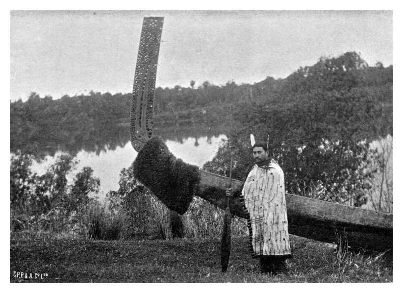 The traditions say that the Maori Pilgrim Fathers left the island of Hawaiki for New Zealand about the beginning of the 15th century. Hawaiki is probably one of the "shores of old romance." Other Polynesian races also claim to have come thence. Mr. Percy Smith gives good reasons for the suggestion that the ancestors of the Maoris migrated from the Society Islands and from Rarotonga, and that their principal migration took place about five hundred years ago. It seems likely enough, however, that previous immigrants had gone before them. One remnant of these, the now almost extinct Moriori, colonised the Chatham Islands, whither they were not followed by the conquering Maori until the present century. The two most famous of the great double canoes of the Maori settlers were the Arawa (shark), and the Tainui (flood-tide). On board thereof, with the men, women, and children, were brought dogs, rats, the gourd and taro root, and the invaluable kumara or sweet potato. The karaka tree, whose glossy, almost oily-looking leaves were in after days to be seen in every village, was another importation. With these tradition ranks the green parakeet and blue pukeko or swamp-hen, two birds whose rich plumage has indeed something in it of tropical gaudiness, at any rate in contrast with the sober hues of most New Zealand feathers. The Tainui canoe was said to have found its last resting-place near the mouth of the Mokau river. A stone still lies there which is treasured by the natives as the ancient anchor of their sacred craft. Some years ago, when a European carried this off, they brought an action against him and obtained an order of the Court compelling him to restore it. Not far away stands a grove of trees alleged to have sprung from the Tainui's skids. Certainly Sir James Hector, the first scientific authority in the Colony, finding that these trees grow spontaneously nowhere else in New Zealand, named them Pomaderris Tainui. But though, for once, at any rate, science was not indisposed to smile on tradition and Maori faith triumphed, and the unbeliever was for a while confounded, it unhappily seems now quite certain that the congener of Pomaderris Tainui is found only in Australia, one of the few lands nigh the Pacific which cannot have been Hawaiki.