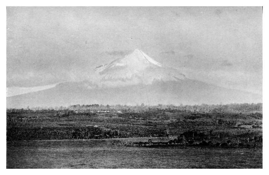 Features for which the traveller in New Zealand should be prepared are the far-reaching prospects over which the eye can travel, the sight and sound of rapid water, and the glimpses of snow high overhead, or far off—glimpses to be caught in almost every landscape in the South Island and in many of the most beautiful of the North. Through the sunny, lucid atmosphere it is no uncommon thing to see mountain peaks sixty and eighty miles away diminished in size by distance, but with their outlines clearly cut. From great heights you may see much longer distances, especially on very early mornings of still midsummer days. Then, before the air is heated or troubled or tainted, but when night seems to have cooled and purged it from all impurity, far-off ridges and summits stand out clean, sharp and vivid. On such mornings, though standing low down by the sea-shore, I have seen the hills of Bank's Peninsula between sixty and seventy miles off, albeit they are not great mountains. Often did they seem to rise purple-coloured from the sea, wearing "the likeness of a clump of peaked isles," as Shelley says of the Euganean hills seen from Venice. On such a morning from a hill looking northward over league after league of rolling virgin forest I have seen the great volcano, Mount Ruapehu, rear up his 9,000 feet, seeming a solitary mass, the upper part distinctly seen, blue and snow-capped, the lower bathed and half-lost in a pearl-coloured haze. Most impressive of all is it to catch sight, through a cleft in the forest, of the peak of Mount Egmont, and of the flanks of the almost perfect cone curving upward from the sea-shore for 8,300 feet. The sentinel volcano stands alone. Sunrise is the moment to see him when his summit, sheeted with snow, is tinged with the crimson of morning and touched by clouds streaming past in the wind. Lucky is the eye that thus beholds Egmont, for he is a cloud-gatherer who does not show his face every day or to every gazer. Almost as fine a spectacle is the sight of the "Kaikouras," or "Lookers-on." When seen from the deck of a coasting steamer they seem almost to hang over the sea heaving more than 8,000 feet below their summits. Strangely beautiful are these mighty ridges when the moonlight bathes them and turns the sea beneath to silver. But more, beautiful are they still in the calm and glow of early morning, white down to the waist, brown to the feet with the sunshine full on their faces, the blue sky overhead, and the bluer sea below.