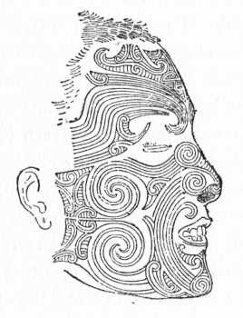 But, however the Moko artist learned his designs, he was a painstaking and conscientious craftsman in imprinting them on his subject. No black-and-white draughtsman of our time, no wood-cutter, etcher, or line-engraver, worked with slower deliberation. The outlines were first drawn with charcoal or red ochre. Thus was the accuracy of curve and scroll-work ensured. Then, inch by inch, the lines were cut or pricked out on the quivering, but unflinching, human copper-plate. The blood was wiped away and the narahu (blue dye) infused. In the course of weeks, months, or years, as leisure, wealth, or endurance permitted, the work was completed. In no other society did the artist have his patron so completely at his mercy. Not only was a Moko expert of true ability a rarity for whose services there was always an "effective demand," but, if not well paid for his labours, the tattooer could make his sitter suffer in more ways than one. He could adroitly increase the acute anguish which had, as a point of honour, to be endured without cry or complaint; or he could coolly bungle the execution of the design, or leave it unfinished, and betake himself to a more generous customer. A well-known tattooing chant deals with the subject entirely from the artist's standpoint, and emphasises the business principles upon which he went to work. It was this song that Alfred Domett (Robert Browning's Waring) must have had in his mind when, in his New Zealand poem, he thus described the Moko on the face of the chief Tangi-Moana:—
