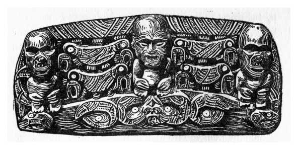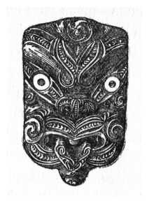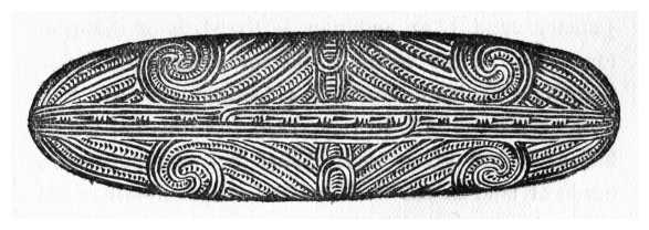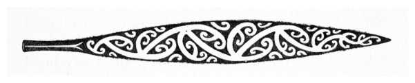 Nor did Maori skill confine itself to ornamenting the clothing of man. The human skin supplied a fresh and peculiar field for durable decoration. This branch of art, that of Moko or tattooing, they carried to a grotesque perfection. Among the many legends concerning their demi-god Maui, a certain story tells how he showed them the way to tattoo by puncturing the muzzle of a dog, whence dogs went with black muzzles as men see them now. For many generations the patterns cut and pricked on the human face and body were faithful imitations of what were believed to be Maui's designs. They were composed of straight lines, angles, and cross-cuts. Later the hero Mataora taught a more graceful style which dealt in curves, spirals, volutes and scroll-work. Apart from legend it is a matter of reasonable certitude that the Maoris brought tattooing with them from Polynesia. Their marking instruments were virtually the same as those of their tropical cousins; both, for instance, before the iron age of the nineteenth century, often used the wing-bones of sea-birds to make their tiny chisels. Both observed the law of tapu under which the male patients, while undergoing the process of puncturing, were sacred, immensely to their own inconvenience, for they had to dwell apart, and might not even touch food with their hands. As to the source of the peculiar patterns used by the New Zealanders, they probably have some relation with the admirable wood-carving before mentioned. Either the Moko artists copied the style of the skilful carvers of panels, door-posts, clubs, and the figure-heads on the prows of canoes, or the wood-carvers borrowed and reproduced the lines and curves of the Moko. The inspiration of the patterns, whether on wood or skin, may be found in the spirals of sea-shells, the tracery on the skin of lizards and the bark of trees, and even, it may be, in the curious fluting and natural scroll-work on the tall cliffs of the calcareous clay called papa.