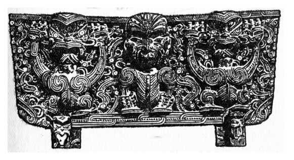 Maori house-building showed a knowledge of architecture decidedly above that of the builders of Kaffir kraals, to say nothing of the lairs of the Australian blacks. The poorest huts were definitely planned and securely built. The shape was oblong, the walls low, the roof high pitched and disproportionately large, though not so much so as in some of the South Sea Islands. The framework was of the durable totara-wood, the lining of reeds, the outside of dried rushes. At the end turned to the sunshine was a kind of verandah, on to which opened the solitary door and window, both low and small. The floor was usually sunk below ground, and Maori builders knew of no such thing as a chimney. Though neither cooking nor eating was done in their dwelling-houses, and offal of all kinds was carefully kept at a decent distance, the atmosphere in their dim, stifling interiors was as a rule unendurable by White noses and lungs. Even their largest tribal or meeting halls had but the one door and window; the Maori mind seemed as incapable of adding thereto, as of constructing more than one room under a single roof. On the other hand, the dyed patterns on the reed wainscoting, and the carvings on the posts, lintel and boards, showed real beauty and a true sense of line and curve.