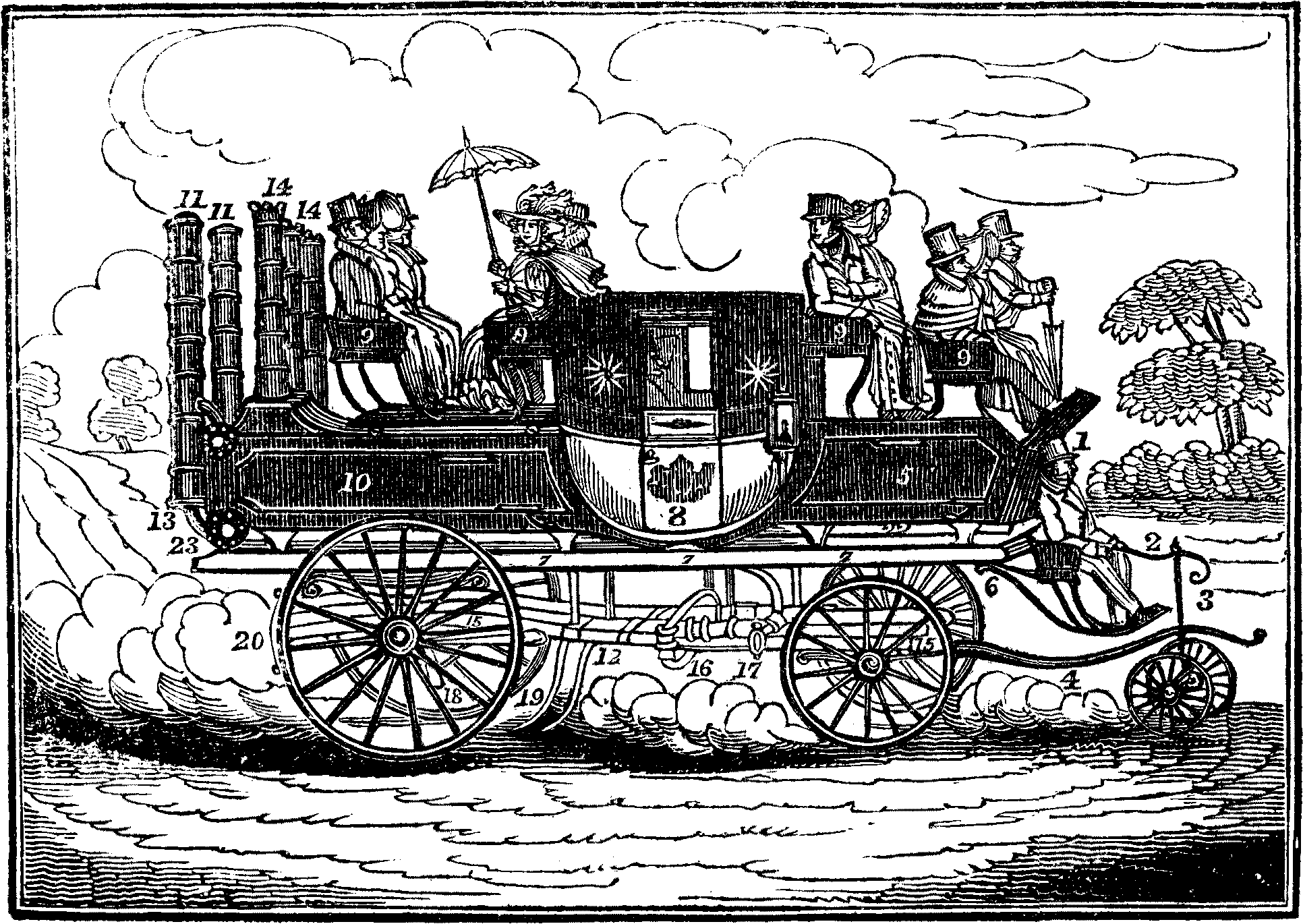 A contemporary journal illustrates Mr. Gurney's invention by the following analogy:—"It will appear not a little singular that Mr. Gurney, who was educated a medical man, has actually made the construction of the human body, and [pg 395] of animals in general, the model of his invention. His reservoirs of steam and water, or rather 'separators,' as they are called, and which are seen at the end of our plate, are, as it were, the heart of his steam apparatus, the lower pipes of the boiler are the arteries, and the upper pipes the veins. The water, which is the substitute for blood, is first sent from the reservoirs into the pipes—the operation of fire soon produces steam, which ascends through the pipes to the upper part of the reservoir, carrying with it a portion of water into the separators, which of course descends to the lower part, and returns to fill the pipes which have been exhausted by the evaporation of the steam—the steam above pressing it down with an elastic force, so as to keep the arteries or pipes constantly full, and preserve a regular circulation. In the centre of the separators are perforated steam pipes, which ascend nearly to the tops, these tops being of course closed, so as to prevent the escape of the steam. Through these pipes the steam descends with its customary force, and is conducted by one main pipe all along under the carriage to the end of the platform, which is, in point of fact, the water tank, where it turns under till it reaches two large branch pipes which communicate with the cylinders, from which the pistons move and give motion to the machinery. The cranks of the axle are thus set in action, and the rotatory movement is given to the wheels. By the power thus engendered also a pump is worked, and which, by means of a flexible hose, pumps the water into the boiler, keeping the supply complete. The tank and furnace, it is calculated will hold sufficient water and fuel for one hour's consumption, the former being sixty gallons."