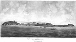 At two. P.M. came to an anchor before the fort and settlement of Bance Island, which we saluted with seven guns. The river is navigable up to this island for ships, and small craft proceed a number of miles higher, on the branches of the Port Logo and Rochell. It is obscured from the view by the island of Tasso, until bearing round a point of that island called Tasso Point; the eye is then attracted by a regular fortification, and even an elegant range of buildings and store-houses, which, with great propriety, may be considered as one of the most desirable positions upon the windward coast of Africa, to command the interior commerce of the countries bordering upon the river Sierra Leone and its branches, and that of the rivers to the northward, the Scarcies and adjoining rivers, the Rio Pongo, with the Isles De Loss, Rio Grande, Rio Noonez, &c. and those which fall into the sea from Cape Sierra Leone to Cape Palmas.