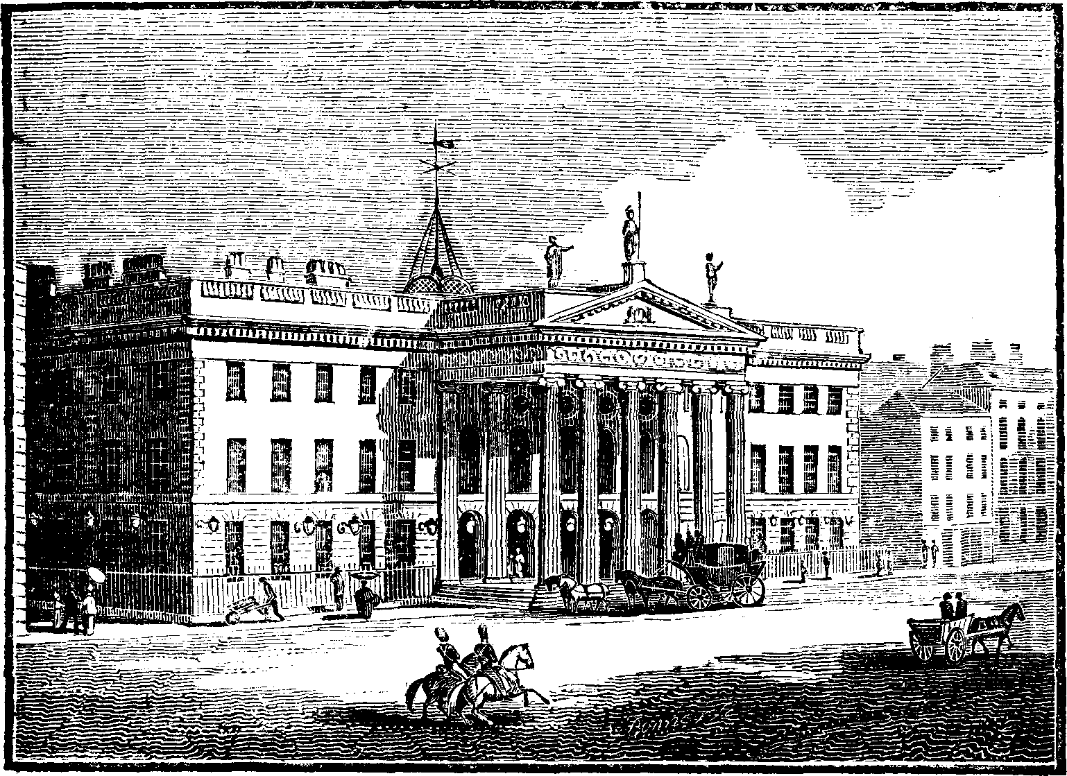 The front, which extends 220 feet, has a magnificent portico (80 feet wide), of six fluted Ionic columns, 4 feet 6 inches in diameter. The frieze of the entablature is highly enriched, and in the tympanum of the pediment are the royal arms. On the acroteria of the pediment are three statues by John Smyth, viz.—Mercury on the right, with his Caduceus and purse; On the left Fidelity, with her finger on her lip, and a key in her hand; and in the centre Hibernia, resting on her spear, and holding her shield. The entablature, with the exception of the architrave, is continued along the rest of the front; the frieze, however, is not decorated over the portico. A handsome balustrade surmounts the cornice of the building, which is 50 feet from the ground. With the exception of the portico, which is of Portland stone, the whole is of mountain granite. The elevation has three stories, of which the lower or basement is rusticated, and in this respect it resembles the India House of London, where a rusticated basement is introduced, although the portico occupies the entire height of the structure.