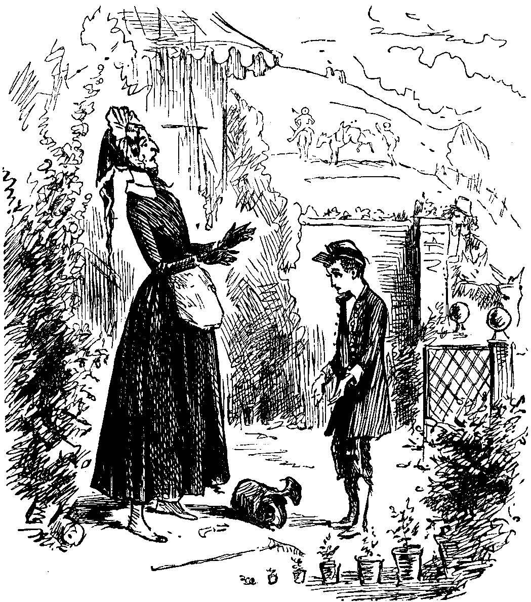 Saw OLD MORALITY off at the station. Came back to pack up our spade and hoe, and leave some general instructions with ARPACHSHAD. He seems much touched at the approaching separation. Quite unable to continue the lawn-mowing. Followed us about with his jack-knife open, clipping here and there a dead stem, so as to keep up an appearance of incessant labour.