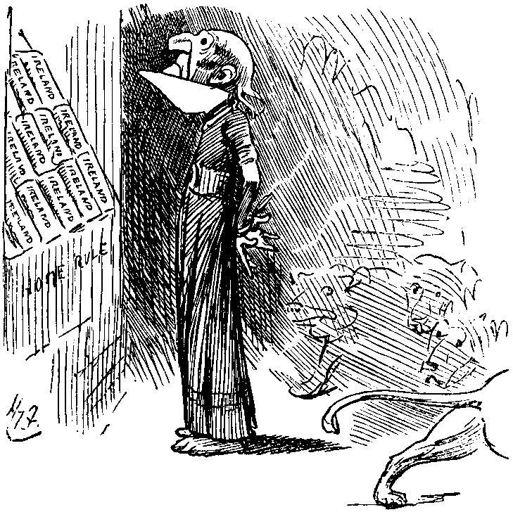 [But behold the tale that was told unto St. Stephen's Guest by the Ancient Mariner is now known unto all men, from repeated and prolix narrations; the tale to wit of the Mariner's startling adventure in unsailed seas on board his suddenly launched Home Rule Argo; how that the Ancient Mariner shot the Oof Bird (that made the (financial) mare to go, and the (party) breeze to blow); how that his shipmates cried out against the Ancient Mariner for killing the bird of good luck, which lay the golden eggs, but how, when the fog cleared off, they justified the same, and thus made themselves accomplices in the act; how "the spell began to break;" how "the Mariner hath been cast into a trance, and the angelic power" (of speech) "causeth the vessel to drive northward faster than" (ordinary) human "life could endure"; how in the Mariner's opinion the Home Rule Argo yet "stoppeth the way," and until it hath free course must impede the fair navigation of the (political) ocean; and how, finally, he, the Ancient Mariner, is constrained to "pop up" and repeat this tale of change and chance unto the appointed persons.]