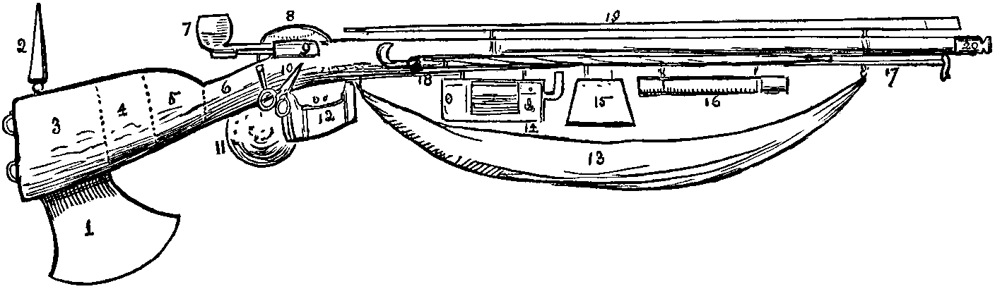 1. A Hatchet (to pull out and fix inside); 2. A Spear (ditto); 3,4,5. Compartments with handles, to be used as Portmanteau; 6. Shirt Collars and Evening Tie; 7. A Pipe; 8. Tobacco; 9. Cigarette Case; 10. Sandwich Case, Potted Meats, Biscuits, &c.; 11. A Self Air-Loading Bullet Mechanism; 12. Gladstone Bag; 13. Portable Bath and Hammock; 14. Cooking Stove; 15. Cooking Utensils; 16. A Telescope; 17. A Walking Stick; 18. An Umbrella; 19. A Billiard Cue; 20. A Scent Bottle.