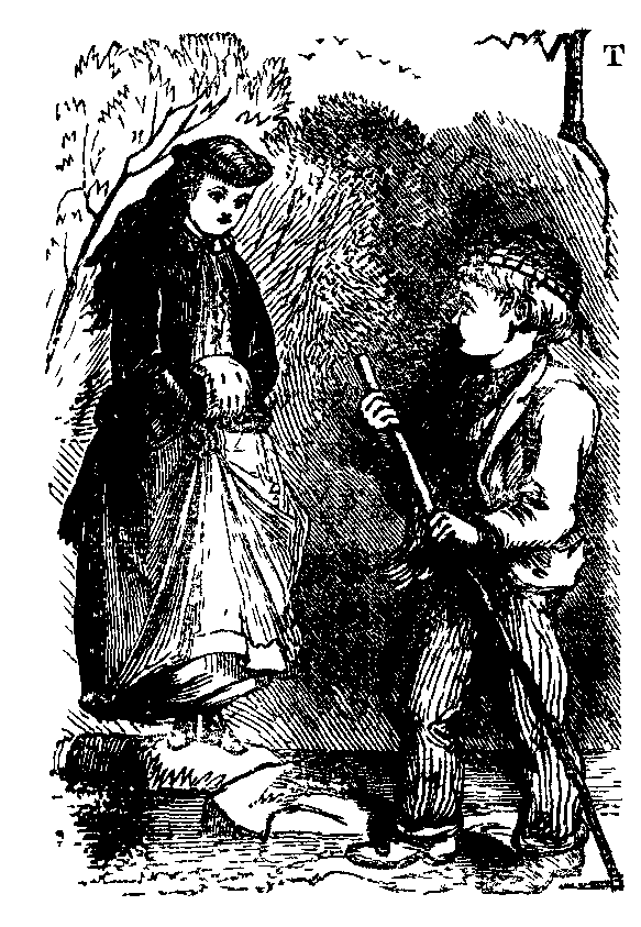 Grace stood bewildered, balancing herself on the stepping-stones; the apparition was so sudden that it almost took away her breath, and the commands were so peremptory that she did not dare to disregard them by going forward; but it seemed very hard to beat an ignominious retreat, for here seemed to be just what she was in search of—a boy as neglected-looking as any that were to be seen in the courts and alleys of Edinburgh; of the very type which old Adam declared there was not one to be found in all the lands of Kirklands. His head was bare, and his flaxen hair so bleached by the sun that it looked quite white against his bronzed face. He looked at Grace with a grave interest in his large blue eyes, as if he would like to know a little more; but he still brandished his cudgel before her, and shouted resolutely: