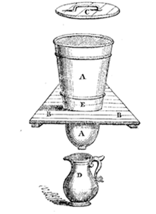 Herewith I send you an outline drawing of an economical filtering apparatus, suitable for the use of any dwelling. Its construction is perfectly simple, and at the cost of a few shillings in its erection. The pot consists of an unglazed inverted vessel, manufactured at potteries for the use of sugar-bakers, and placed through a hole in a triangular board, resting upon two ledges, occupying a corner in a kitchen or any other apartment. In the inside of the pot a bushel of the whitest sand is to be introduced; which sand, after being washed in a clean tub with about three changes of water, to dissolve and clear away the clayey matter, is to be mixed with half a peck of finely-bruised charcoal. This will fill about one-third of the pot; but before the sand is placed in the vessel, the small hole at the bottom of the pot should have an oyster-shell placed over it, with the convex side uppermost, to prevent the sand washing through. This filters foul water perfectly pellucid and clear very quickly, as I have seen its effects for years with the most perfect success. When the sand becomes foul by time, it can be taken out and washed, or fresh materials can be repeated; great care should be observed not to put more water in the pot than your vessel underneath will receive.