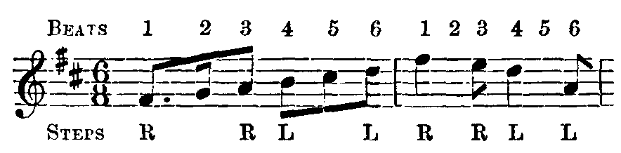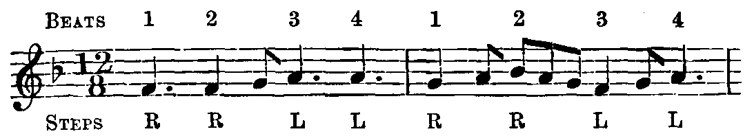 This, as the name denotes, is the tune to which the dancers step as they leave the scene—be it stage, or high road, or village green—of their performance. Its execution is very simple, and there is no limit to the number of times the eight-bar measure may be played—or rather, the limit is set according to the fancy of the leader, for he may, if he pleases, and if the audience manifests no impatience, lead his side back and forth in a serpentine track, round and round for ever so long, till finally they wind from the scene.