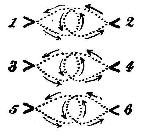 | Bars 5 to 8 | Nos. 5 and 6 loose hands. No. 5 joins hands with No. 1, and No. 6 with No. 2, forming two rings, one to each file. Each ring will form round about the line of position of its numbers when in file. | Two Rings. |