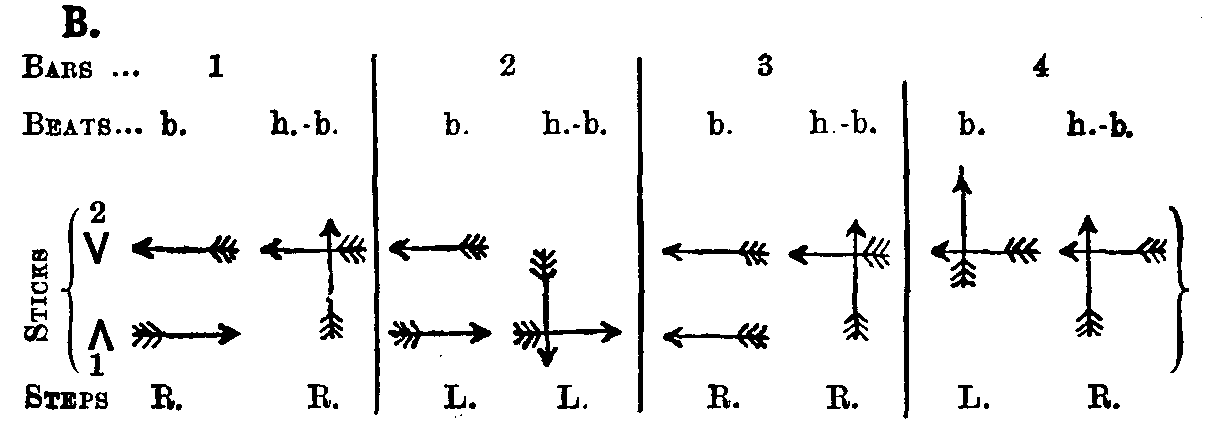 | A. (1st time). | Step 4/2 throughout "A" music in all repetitions. Down-and-back twice. Partners tap sticks across on last two beats of bars 4 and 8; but on making last tap but one, j. (forming Fr.), so that final tap is given in Front formation. | " " Col. to Front. |