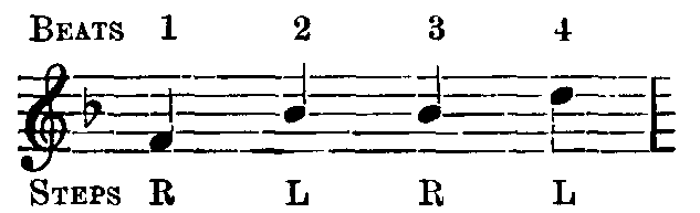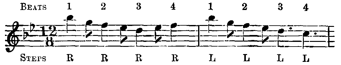 The side is now going slowly forward, in the manner of "Follow my leader." In every repetition of bars 7 and 8, all make a complete right turn, as already described, so that at the repeat of the first bar all are again facing in the course the leader shall have set.