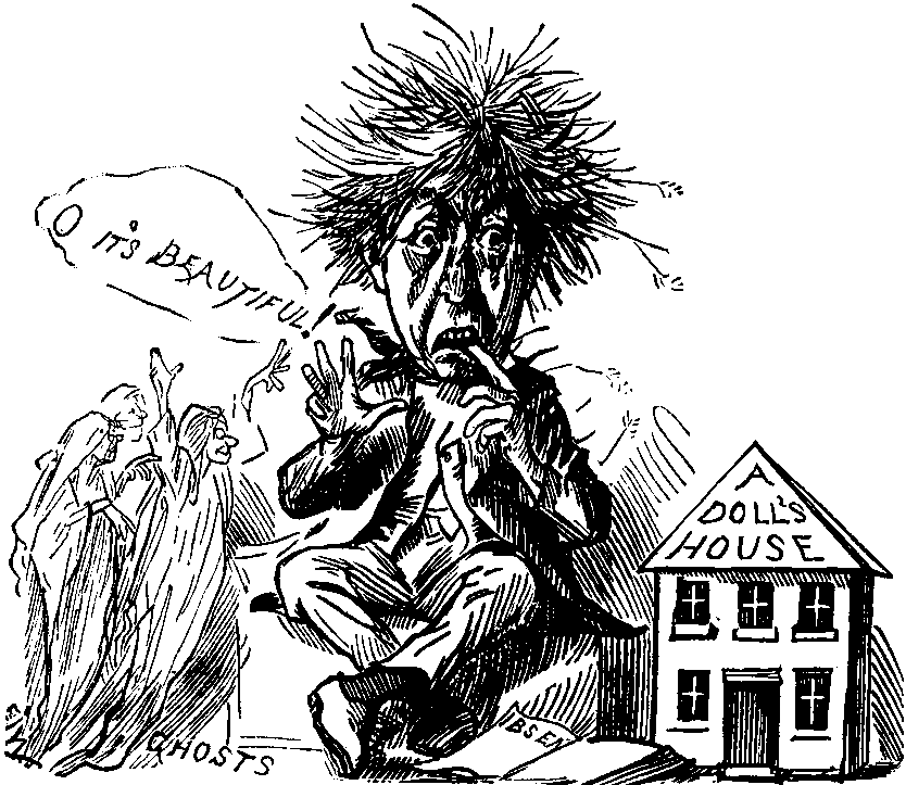 Mr. M.-J. You'd better, that's all! Are you ready? I must screw myself up another peg before I begin. (He screws.) Now, then. (Stands over her and dictates.) "To the polished urbanity of a perfect gentleman, he unites the kindly charity of a true Christian." (Why the devil don't you learn to write decently, eh?) "Liberal, and even lavish, in all his dealings, he is yet a stern foe to every kind of excess"—(Hold on a bit, I must have another nip after that)—"every kind of excess. Our married life is one long dream of blissful contentment, in which each contends with the other in loving self-sacrifice." (Haven't you corked all that down yet!) "Such cares and anxieties as he has, he conceals from me with scrupulous consideration as long as possible"—(Gad, I should be a fool if I didn't!)—"while I am ever sure of finding in him a patient and sympathetic listener to all my trifling worries and difficulties."—(Two f's in difficulties, you little fool—can't you even spell?) "Many a time, falling on his knees at my feet, he has rapturously exclaimed, his accents broken by manly emotion, 'Oh, that I were more worthy of such a pearl among women! With such a helpmate, I am indeed to be envied!'" That ought to do the trick. If I don't romp in after that!—(Observing that Mrs. M.-J.'s shoulders are convulsed.) What the dooce are you giggling at now?