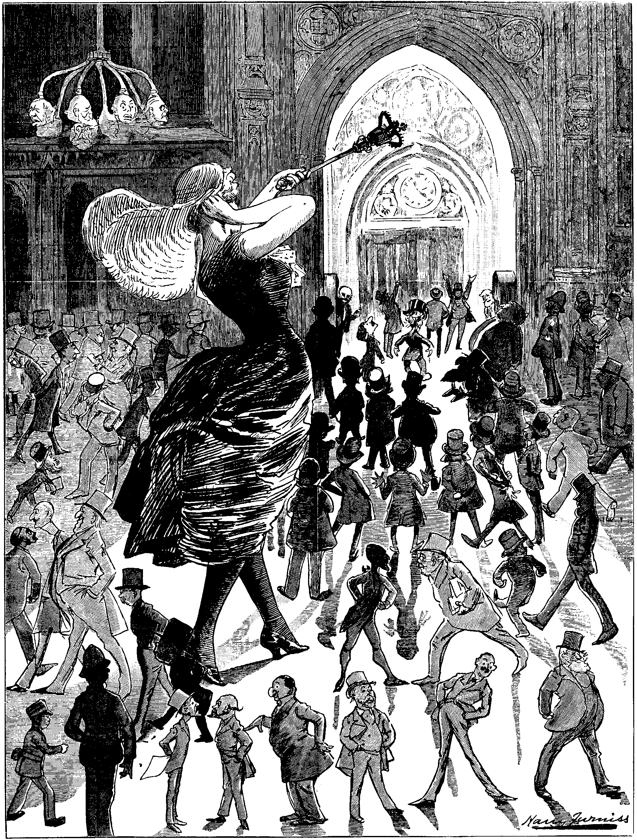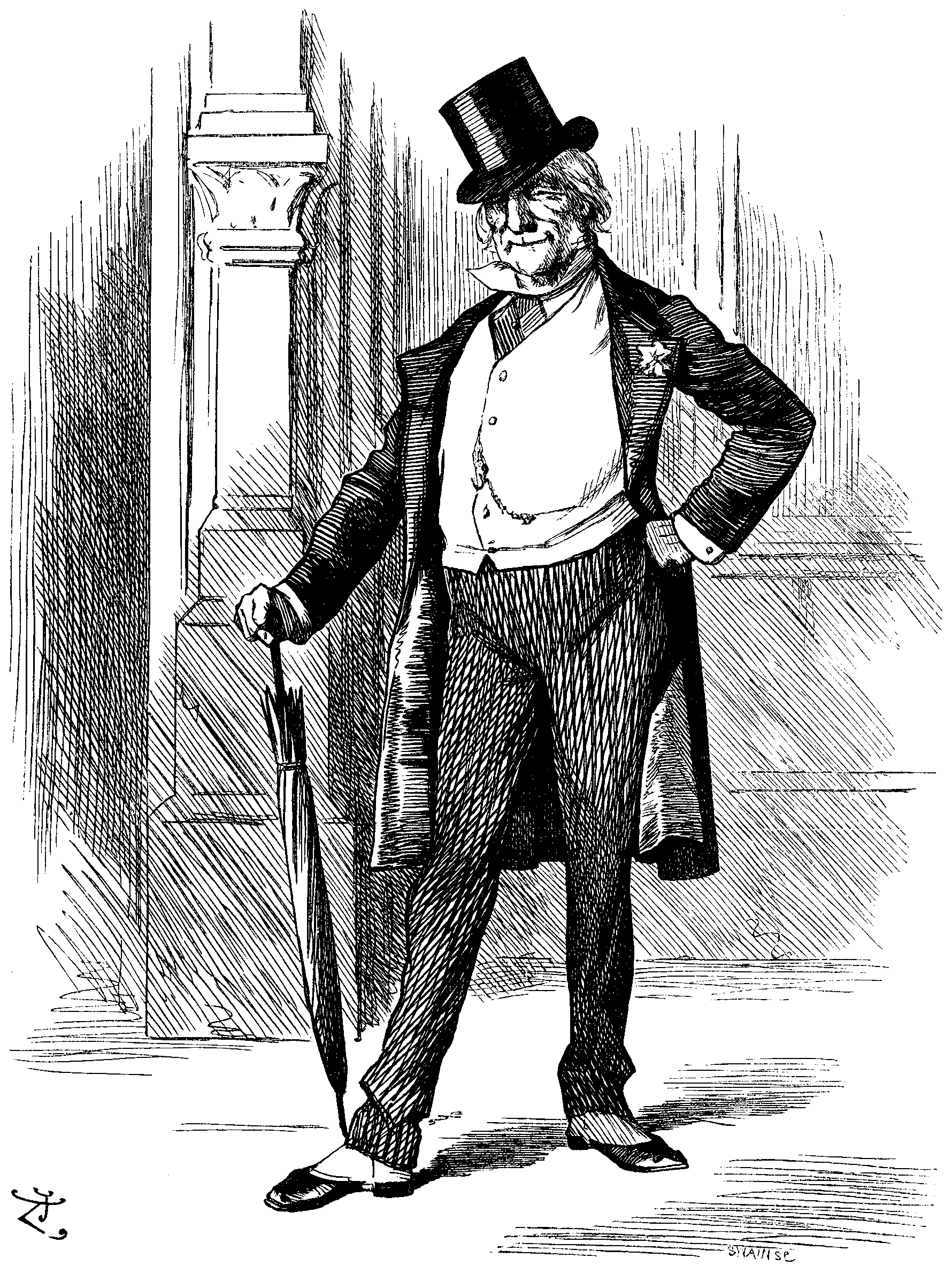 Later came upon NICHOLAS WOODS; found him standing in attitude of patient and intelligent expectation. "What are you waiting there for?" I asked. "Why don't you come in and hear SWINBURNE make one or two speeches on Tithes Bill?"