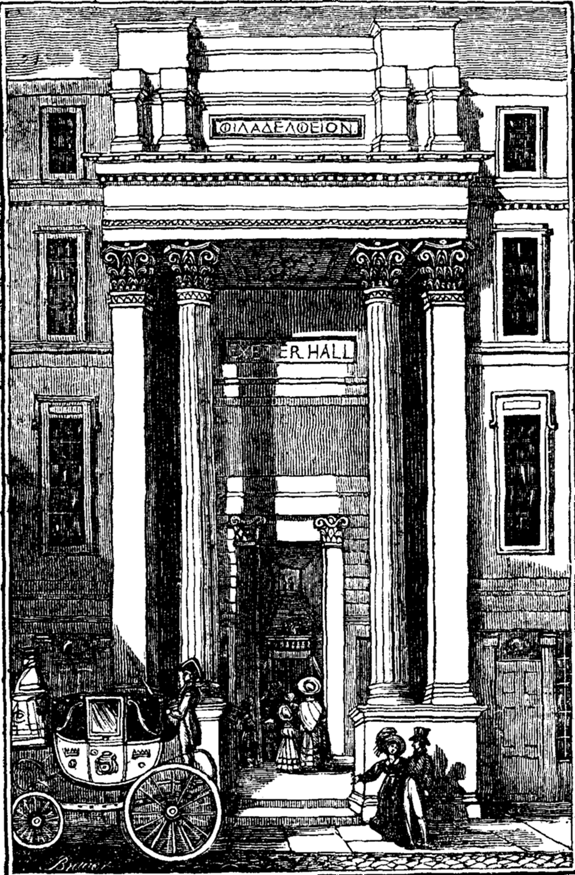 This building is, perhaps, the most perfect erection of its kind in England. The approach from the Strand is remarkably modest: it is by a very narrow, though very chaste, door-way, situated between two Corinthian columns and pilasters. Within the door is a hall, with two flights of steps, which afterwards unite, and lead up to the entrance of the great hall itself; the hall below leads into a broad passage, which extends to the farther extremity of the building, opening right and left into various offices. On entering the door of the great hall, a vast and splendid room is presented to view, with scarcely a single interruption to the eye throughout its whole extent, capable of containing, with comfort, more than 3,000 persons. The floor is covered with substantial oak seats, equal to the accommodation [pg 402] of 2,500 persons. The greater portion of these are situated on a gentle rise, to permit a perfect view of the platform on which the proceedings take place. The platform is raised about six feet from the floor, and extends the whole breadth of the room, curving inwards, the extremities bending towards the audience: it contains seats for nearly 300 individuals. Behind this gallery again, are very capacious recesses, which will hold from three to four hundred persons. The lower part of the walls of the room is quite plain, the architect, probably, regarding the audience as a sufficient ornament in that quarter, though the rising of the seats would obscure carved-work if it were there. The windows are at a considerable height from the ground, and are of dimmed glass, with a chaste and classical border. The ceiling, which is at a noble height, is beautifully laid out in squares, with borderings and rosettes. An oblong opening occurs in the centre, with massive beams stretching across, presenting to view an erection in the roof, a form of construction, probably, necessary to so immense a mass of roofing, and serving also for the purposes of ventilation, as it contains windows at each end. There are four pillars near the end of the hall, rising to the ceiling, the capitals of which, as also those of some pilasters at the upper extremity of the hall, are exquisitely carved in straw-coloured marble. Behind the platform are numerous and convenient committee-rooms. The word "Philadelpheion," which may be rendered "loving brothers," is carved in Greek capitals over the entrance in the Strand.1