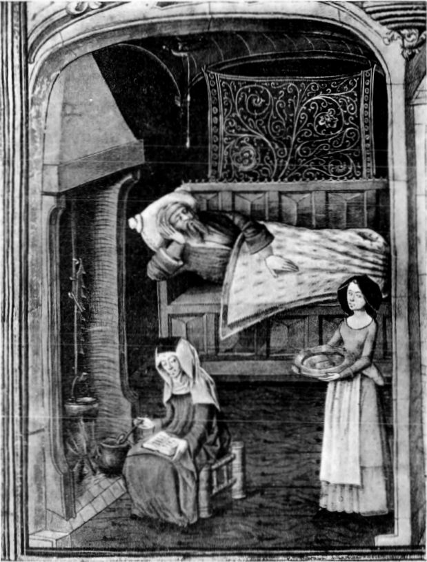 But Ermentrude does not stop at the men's workshop. She finds [pg 025] the steward, bobs her curtsy to him, and gives up her fowl and eggs, and then she hurries off to the women's part of the house, to gossip with the serfs there. The Franks used at this time to keep the women of their household in a separate quarter, where they did the work which was considered suitable for women, very much as the Greeks of antiquity used to do. If a Frankish noble had lived at the big house, his wife would have looked after their work, but as no one lived in the stone house at Villaris, the steward had to oversee the women. Their quarter consisted of a little group of houses, with a workroom, the whole surrounded by a thick hedge with a strong bolted gate, like a harem, so that no one could come in without leave. Their workrooms were comfortable places, warmed by stoves, and there Ermentrude (who, being a woman, was allowed to go in) found about a dozen servile women spinning and dyeing cloth and sewing garments. Every week the harassed steward brought them the raw materials for their work and took away what they made. Charlemagne gives his stewards several instructions about the women attached to his manses, and we may be sure that the monks of St Germain did the same on their model estates. 'For our women's work,' says Charlemagne, 'they are to give at the proper time the materials, that is linen, wool, woad, vermilion, madder, wool combs, teasels, soap, grease, vessels, and other objects which are necessary. And let our women's quarters be well looked after, furnished with houses and rooms with stoves and cellars, and let them be surrounded by a good hedge, and let the doors be strong, so that the women can do our work properly.'[3] Ermentrude, however, has to hurry away after her gossip, and so must we. She goes back to her own farm and sets to work in the little vineyard; then after an hour or two goes back to get the children's meal and to spend the rest of the day in weaving warm woollen clothes for them. All her friends are either working in the fields on their husbands' farms or else looking after the poultry, or the vegetables, or sewing at home; for the women have to work just as hard as the men on a country farm. In Charlemagne's time (for instance) they did nearly all the sheep shearing. Then at last Bodo comes back for his supper, and as soon as the sun goes down they go to bed; for their hand-made candle gives only a flicker of light, and they both [pg 026] have to be up early in the morning. De Quincey once pointed out, in his inimitable manner, how the ancients everywhere went to bed, 'like good boys, from seven to nine o'clock'. 'Man went to bed early in those ages simply because his worthy mother earth could not afford him candles. She, good old lady ... would certainly have shuddered to hear of any of her nations asking for candles. "Candles indeed!" she would have said; "who ever heard of such a thing? and with so much excellent daylight running to waste, as I have provided gratis! What will the wretches want next?"'[4] Something of the same situation prevailed even in Bodo's time.
