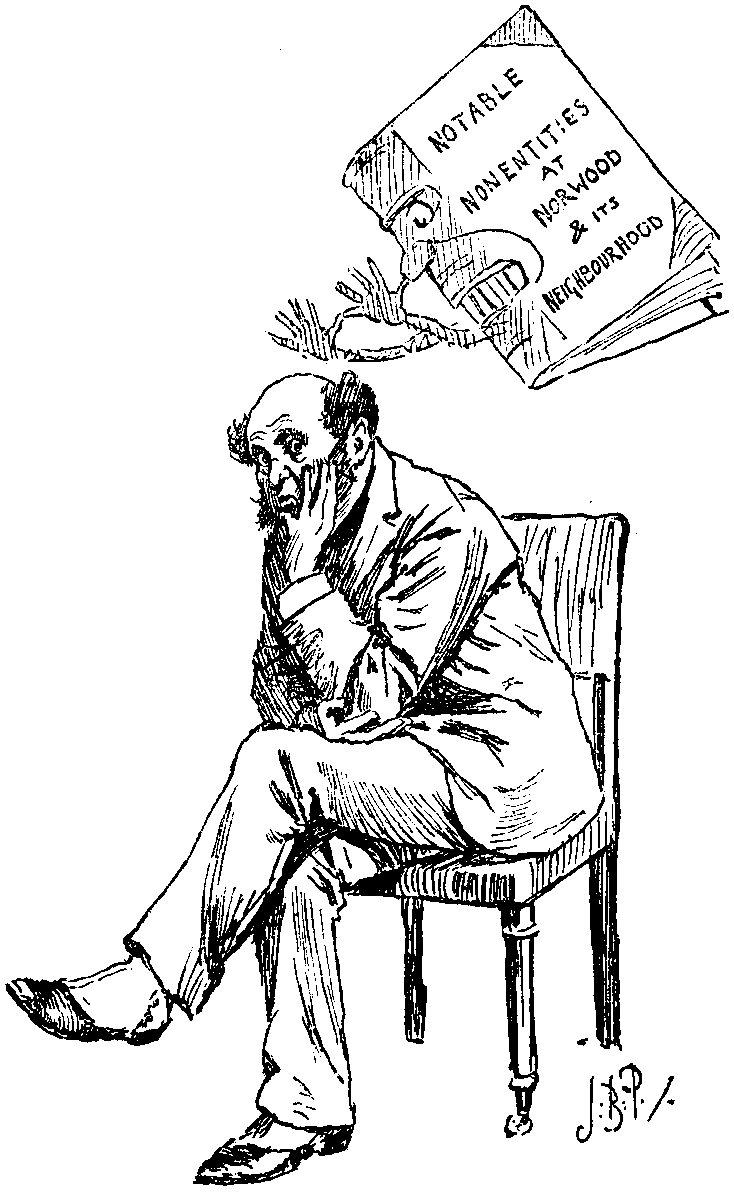 "Pardon me, Mr. LANE," he interrupts, "you mistake my object. I should not dream of expecting you to subscribe to such a work. But, in my capacity of compiler, I naturally desire to leave nothing undone that care and research can effect to render the work complete—and it would be incomplete indeed, were it to include no reference to so distinguished a resident as yourself!" ("Oh, pooh—nonsense!" You will say at this—but you will sit down again) "Norwood is a singularly favoured locality. Sir; its charms have induced many of our foremost men to select it for their rus in urbe. Why, in this very road—May I ask, by the way, if you are acquainted with Alderman MINCING? Alderman MINCING has been good enough to furnish me with many interesting details of his personal career, a photo-gravured portrait of him will be included, with views of the interior and exterior of 'The Drudgeries,' and a bit from the back-garden." (You do know MINCING—and you cannot help inwardly wondering at the absurd vanity of the man—a mere nobody, away from the City!) "Between ourselves," says your interviewer, candidly, having possibly observed your expression, "I am by no means sure that I shall feel warranted in allotting Alderman MINCING as much space as I fear he will consider himself entitled to. Alderman MINCING, though a highly respectable man, does not appeal to the popular imagination as others I could mention do—he is just a little commonplace!" ("Shrewd follow, this!" you think to yourself—"Got MINCING's measure!") "But I should feel it an honour, indeed, if such a man as yourself, now, would give me all the personal information you think proper to make public, while, as a specimen of what Norwood can do in luxurious and artistic domestic fittings, this house, Sir, would be invaluable! I do trust that you will see your way to—" (At first, you suggest that you must talk it over with your Wife—but you presently see that if MINCING and men of that calibre are to be in this, you cannot, for your own sake, hold aloof, and so your Visitor soon has his note-book out.) "Any remarkable traits recorded of you as an infant, Mr. LANE? A strong aversion to porridge, and an antipathy to black-beetles—both of which you still retain? Thank you, very much. And you were educated? At Dulborough Grammar School? Just so! Never took to Latin, or learned Greek? Commercial aptitudes declaring themselves thus early—curious, indeed! Entered your father's office as clerk? Became a partner? Married your present lady—when? In 1860? Exactly!—and have offspring? Your subsequent life comparatively uneventful? That will do admirably—infinitely obliged to you, I am sure. It would be useless to ask you if you would care to have a copy of the work, when issued, forwarded to you—we can do it for you at the very nominal sum of two guineas, if paid in advance—a gratifying possession for your children after you have gone, Mr. LANE! I may put you down? Thank you. For two copies?" (On second thoughts, you do order two copies; you can send one out to your married Sister in Australia—it will amuse her.) "One, two, three, four guineas—quite correct, Mr. LANE, and you shall have an early opportunity of revising a proof, and we will send down a competent artist, in a day or two, to take the photographs. Quite an agreeable change in the weather, is it not? Good day!"