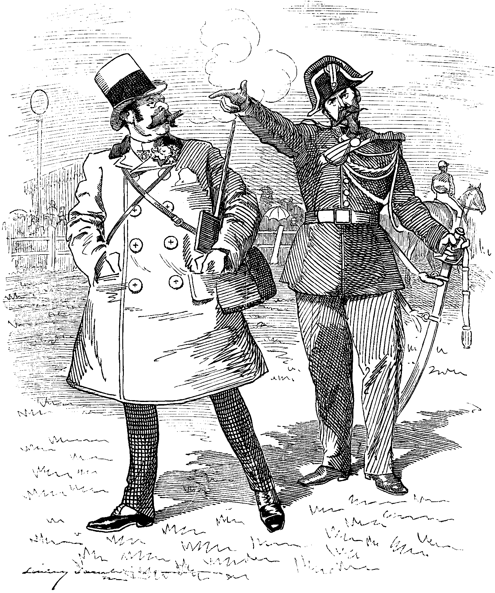 Military Instructor. Dear me! Well, we had better get out of this! By Jove! it looks like the last Act!