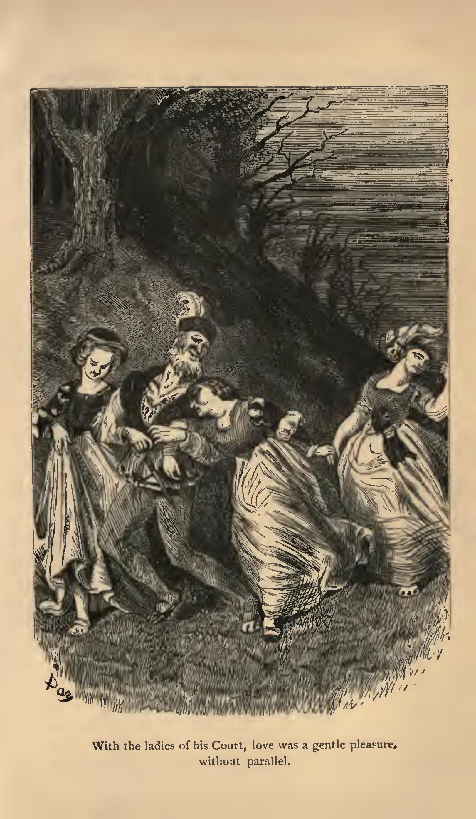 She fell into a violent passion when she saw this handsome gentleman have everything a man can desire, great wealth, royal favour, unequalled love, matchless wife, pleasure such as none other could produce, and yet fail in that which is dearest to the head of the house—namely, lineage. With this idea in her head, she wished to die, thinking how good and noble he had been to her, and how much she failed in her duty in not giving him children, and in being henceforward unable to do so. She hid her sorrow in the secret recesses of her heart, and conceived a devotion worthy her great love. To put into practice this heroic design she became still more amorous, took extreme care of her charms, and made use of learned precepts to maintain her bodily perfection, which threw out an incredible lustre.