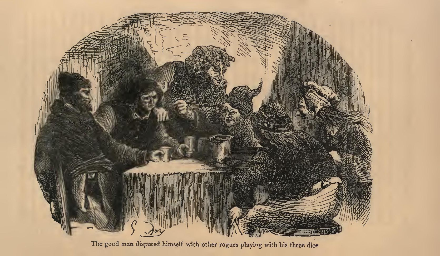 Now in this hostelry the three pilgrims loosened their tongues, and agreed to journey to Rome together, in order the better to resist the foot pads, the night-birds, and other malefactors, who made it their business to ease pilgrims of that which weighed upon their bodies before the pope eased them of that which weighed upon their consciences. After drinking the three companions commenced to talk together, for the bottle is the key of conversation, and each made this confession—that the cause of his pilgrimage was a woman. The servant who watched their drinking, told them that of a hundred pilgrims who stopped in the locality, ninety-nine were travelling from the same thing. These three wise men then began to consider how pernicious is woman to man. The Baron showed the heavy gold chain that he had in his hauberk to present to Saint Peter, and said his crime was such that he would not get rid of with the value of two such chains. The Parisian took off his glove, and exposed a ring set with a white diamond, saying that he had a hundred like it for the pope. The Burgundian took off his hat, and exhibited two wonderful pearls, that were beautiful ear-pendants for Notre-Dame-de-Lorette, and candidly confessed that he would rather have left them round his wife’s neck.