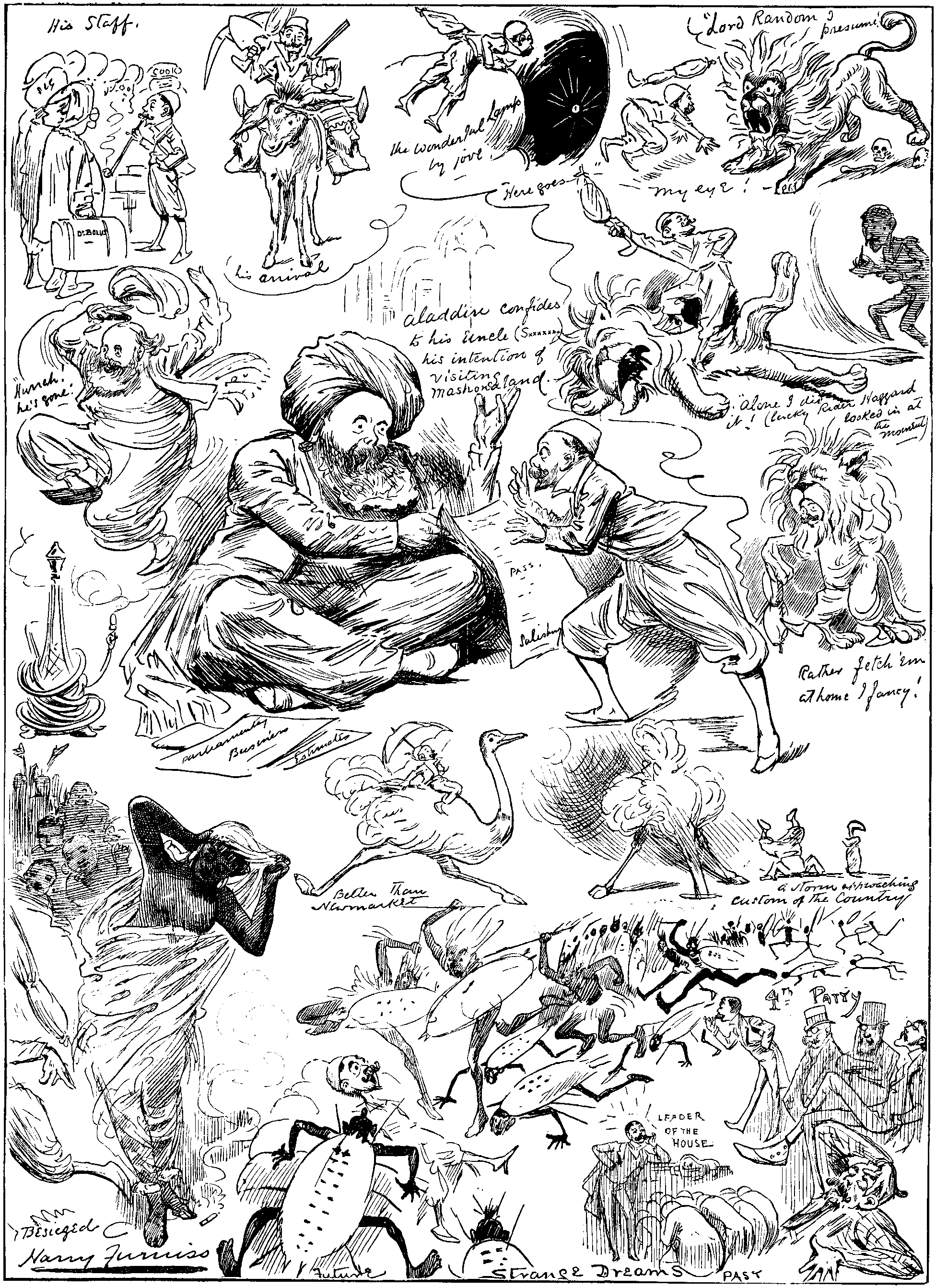 Splendid performance, only wanting an audience. But the storm inside House burst as suddenly as the blizzard without. Nobody knew that the Commodore was close-hauled, and meant business. Few present to witness the perturbed scene on the Treasury Bench:—OLD MORALITY huddled up against GEORGIE HAMILTON, who was nervously tearing sheet of paper into measured strips; JOKIM shaking in every limb, and white to the lips; Prince ARTHUR most successful of the group in maintaining his self-possession, though evidently not liking the reference to STRAFFORD. The Commodore, looking in his tarpaulins considerably more than six foot high, stormed and raged what time the snow and sleet beat a wild accompaniment on the melancholy windows.