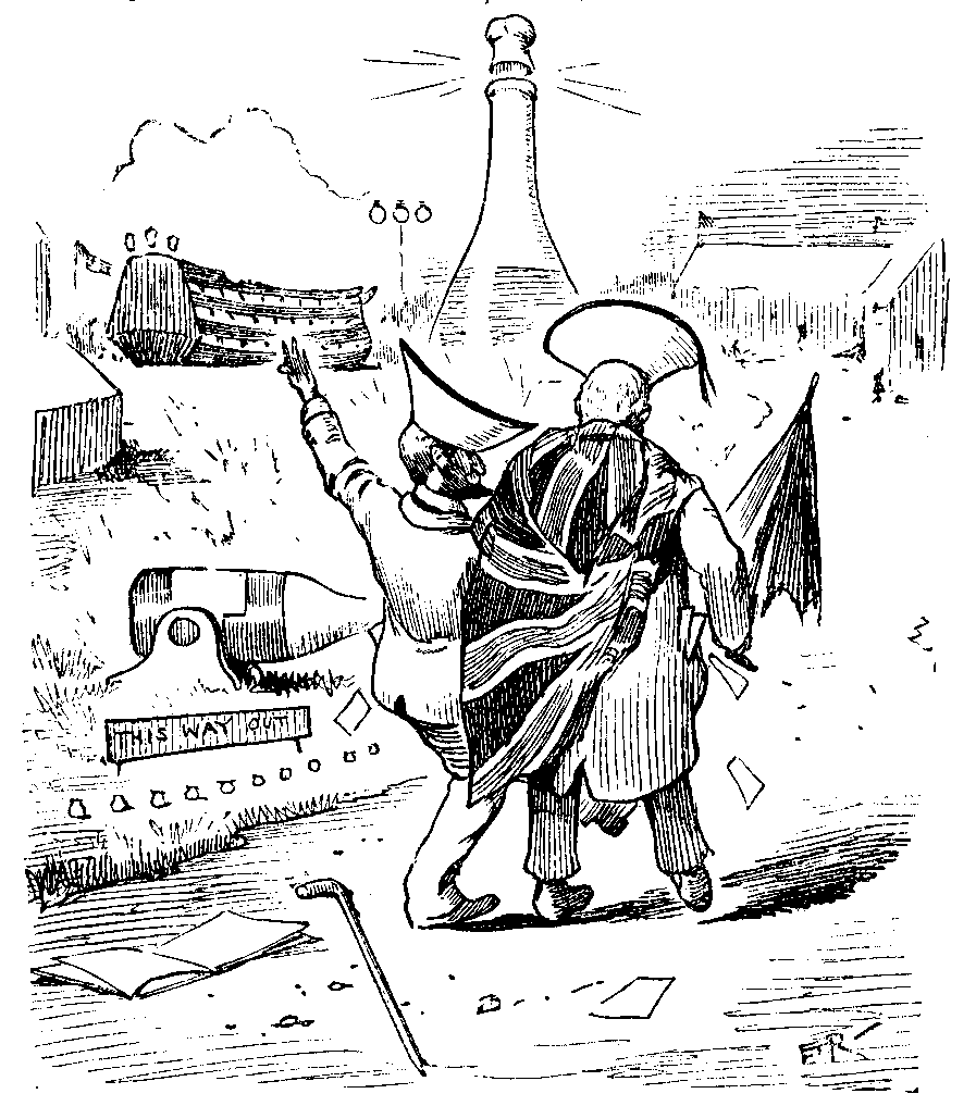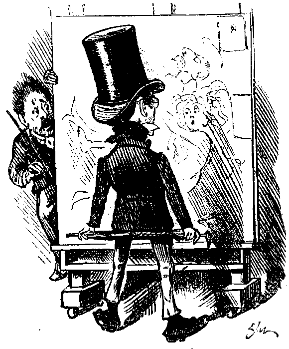 After leaving the Galleries, the Scribe and the Artist looked up at the model of Eddystone Lighthouse, and entered a shed declared to be an "Arctic Scene." Here they were reminded by the introduced ship of those happy days of their boyhood spent in the toy-shops of the Lowther Arcade. Next they visited the Panorama of Trafalgar, and revelled in the carnage of a sea-fight that only required Margate in the distance to be entirely convincing. They glanced at the arena, and gazed with awe at the lake which is to be devoted to the manoeuvring of miniature ironclads. It will be interesting to note whether these mimic combats will hold their own in the coming season against the introduction of capsized clowns, drenched old women, and comic police. Keeping the best for the last, the Scribe and the Artist now entered the model of the Victory—a really admirable exhibition. There they saw before them the old battle-ship with its full equipment, as it was in the days of NELSON—when that deathless hero expected every Englishman (not excluding even those passing the Custom House—as the Committee would say) "to do his duty." To make the illusion complete, the great sea-captain was observed dying in the cook-pit in the agonies of wax. And to think that this work was executed by a firm of house-decorators! Why, who would not, after this, have his back drawing-room converted into the quarter-deck of the Shannon, and his spare bed-room into a tiny reproduction of the Battle of Copenhagen!