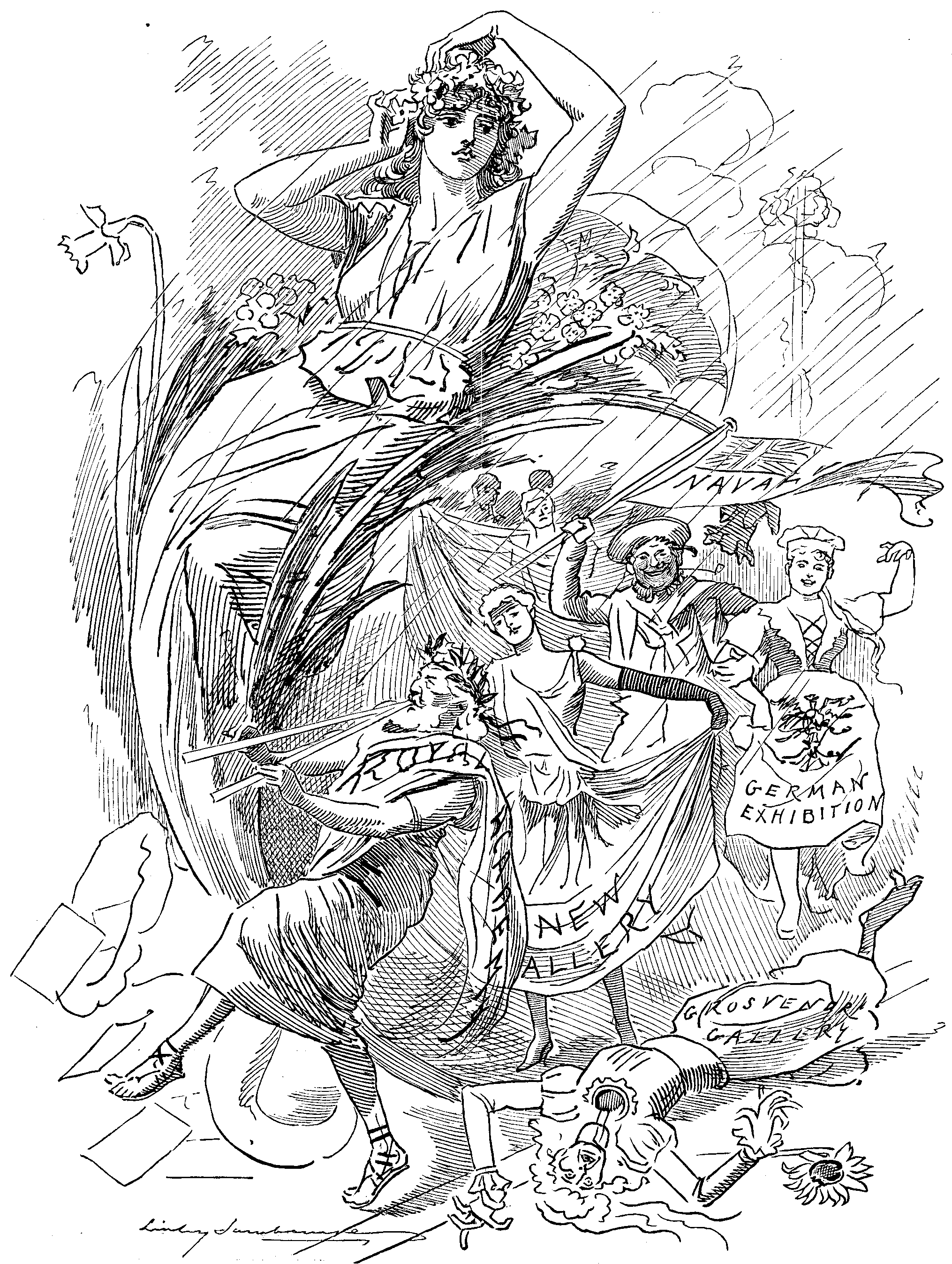 The Scribe and the Artist, having been ordered by He Who Must Be Obeyed in the world generally, and at 85, Fleet Street, in particular, to make a sort of preliminary cruise through the wonders of the (Admiralty) Deep, hastened from the inviting grounds into the main building, with its pictures, its plans, and last, but (it is only just to say) least, its pickles. The first object that attracted their favourable attention was a trophy of arms, representing the fashions of the past and the present. On one side were shrapnel and magazine rifles, on the other flint-locks and the ordnance of an age long gone by. Next they passed through the Arctic section, wherein they found dummies drawing a sledge through the canvas snow of a corded-off North Pole. Then they entered the Picture Galleries called after NELSON and BENBOW, wherein magnificent paintings by POWELL, full of smoke and action, served as an appropriate background to the collection of plate, lent by that gallant sailor-warrior and industrious collector of well-considered trifles, H.R.H. the Duke of EDINBURGH. They glanced at the relics of Trafalgar, and then hurried away to the HOWE Gallery, which, containing as it did specimens of the implements used in the game of golf, might have as appropriately been christened the WHEREFORE. Next they skirted a corridor full of plans, and here they discovered that the Committee of the Exhibition must be wags, every Jack Tar of them! This corridor was close to the Dining-rooms, and the Committee (ha! ha! ha!) had called it (he! he! he!) after COOK! (Ho! ho! ho!) Oh, the wit of it! How the Members of the Executive must have nudged one another in the ribs as the quaint idea dawned upon them! And how they must have laughed, too, on the Opening Day, when the Guard of Honour, presenting arms, and the "Greenwich Boys" singing "Ye Mariners of England," were drenched in the rain! And what a capital notion it was on that occasion to put "the Representatives of the Fourth Estate" (no doubt called by them, with many a sly twinkle of the eye, "the Press Gang") into a pen that soon, thanks to a series of water-spouts, assumed the appearance of a tank!