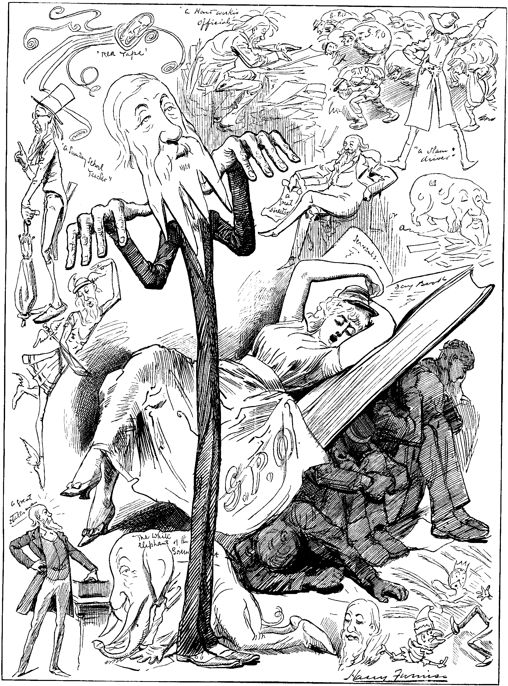 House of Commons, Monday, April 6.—School reopened after Easter Holidays. OLD MORALITY duly in his place, but not many of the boys. Civil Service Estimates on; PLUNKET in charge on Ministerial side; SAGE OF QUEEN ANNE'S GATE Leader of Opposition. Hammered away all night on old familiar lines. Ghosts of old acquaintances feebly crossed floor, disappearing behind SPEAKER's chair. Kensington Palace, with its cost; Bushey House; Cambridge Cottage; admission to Holyrood Palace; the deer in Home Park at Hampton Court; the pheasants in Richmond Park; the frescoes in House of Lords; the Grille of the Ladies' Gallery: the British Consular House at Cairo—each came up in turn; talked about; protested against; explained; divided upon, and voted. PLUNKET left to himself on Treasury Bench; bore up with unflagging energy and perennial patience; has heard same points raised every year since he was First Commissioner; has made same replies, and has seen Votes passed. Long before he was in office same thing used to go on with other First Commissioners. That was before the SAGE had taken to politics. Good old RYLANDS—"Preposterous PETER"—was then the Grand Inquisitor. But it was the same deer, the same gas-bills, the same question of free residence for "that eminent warrior," as the SAGE to-night called him, the Dook of CAMBRIDGE.