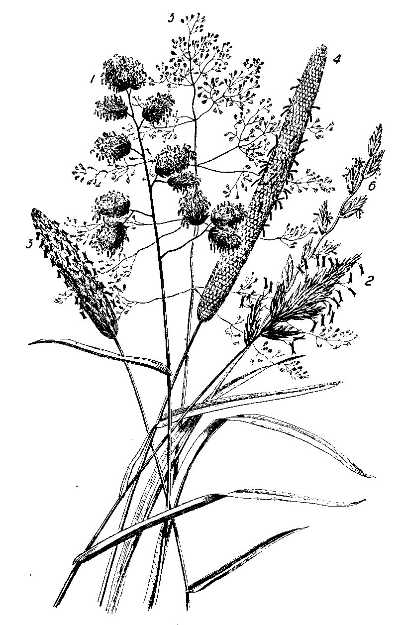 | Grasses. 1. Cocksfoot; 2. Sweet vernal; 3. Meadow foxtail; 4. Common Timothy; 5. Tufted hair; 6. Common rye grass. |