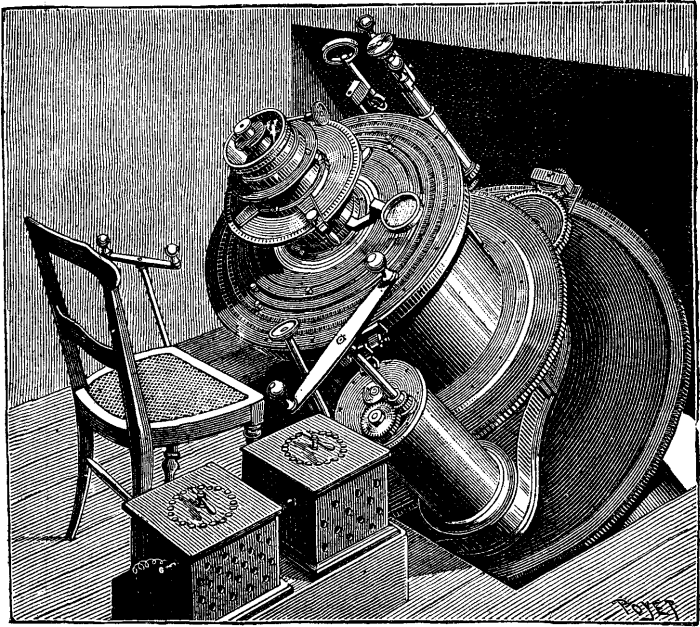 Fig. 2 shows us the room in the observatory in which the astronomer, seated in his chair, is completely protected against the inclemencies of the weather. Here, with his eye applied to the ocular, he can, without changing position (owing to all the handles that act at his will upon the many transmissions necessary for the maneuvering), direct his instrument unaided toward every point of the heavens with wonderful sureness and precision. The observer has before him on the same plane two divided circles, one of which gives the right ascensions and the other the declinations, and which he consults at each observation for the exact orientation of the equatorial.