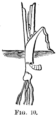 Early in June a somewhat hairy fly, Fig. 9, may be seen flying about, and depositing its eggs on the leaves of the young onion plants, near the roots, Fig. 10.