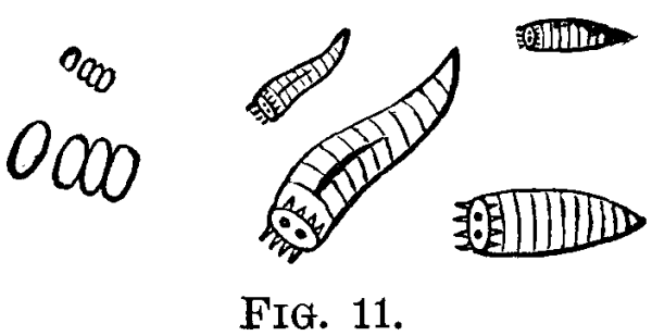 The maggots reach their full growth in about two weeks, when they are about one-third of an inch long, white and glossy, tapering from the posterior end to the head, which is armed with a pair of black, hook-like jaws. The opposite end is cut off obliquely and has eight tooth-like projections around the edge, and a pair of small brown tubercles near the middle. Fig. 11 shows the eggs, larva, and pupa, natural size and enlarged.