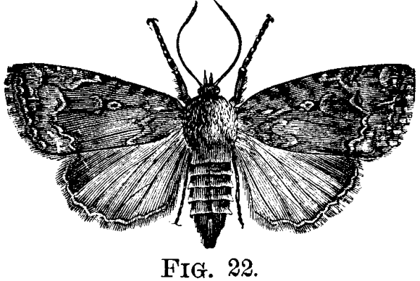 In the latter part of July the perfect moth, Fig. 22, emerges, measuring, when its wings are expanded, about one and three-fourths inches; the fore wings are dark brown shaded with lighter, with dots and wavy lines of dull white. The hind wings are reddish, or of a bright copper color, shading to brown on the outer angle of the front edge of the wing, and paler toward the hinder and inner angle.