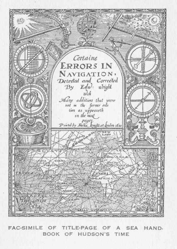 The copy of Wright's famous work on navigation that Hudson may have had, and probably did have, with him was of an earlier date than that (1610) of which the title-page here is reproduced. This reproduction is of interest in that it shows at a glance all of the nautical instruments that Hudson had at his command; and of a still greater interest in that the map which is a part of it exhibits what at that time, by exploration or by conjecture, was the known world. To the making of that map Hudson himself contributed: on it, with a previously unknown assurance, his River clearly is marked. The inadequate indication of his Bay probably is taken from Weymouth's chart—the chart that Hudson had with him on his voyage. A curious feature of this map is its marking—in defiance of known facts—of two straits, to the north and to the south of a large island, where should be the Isthmus of Panama.