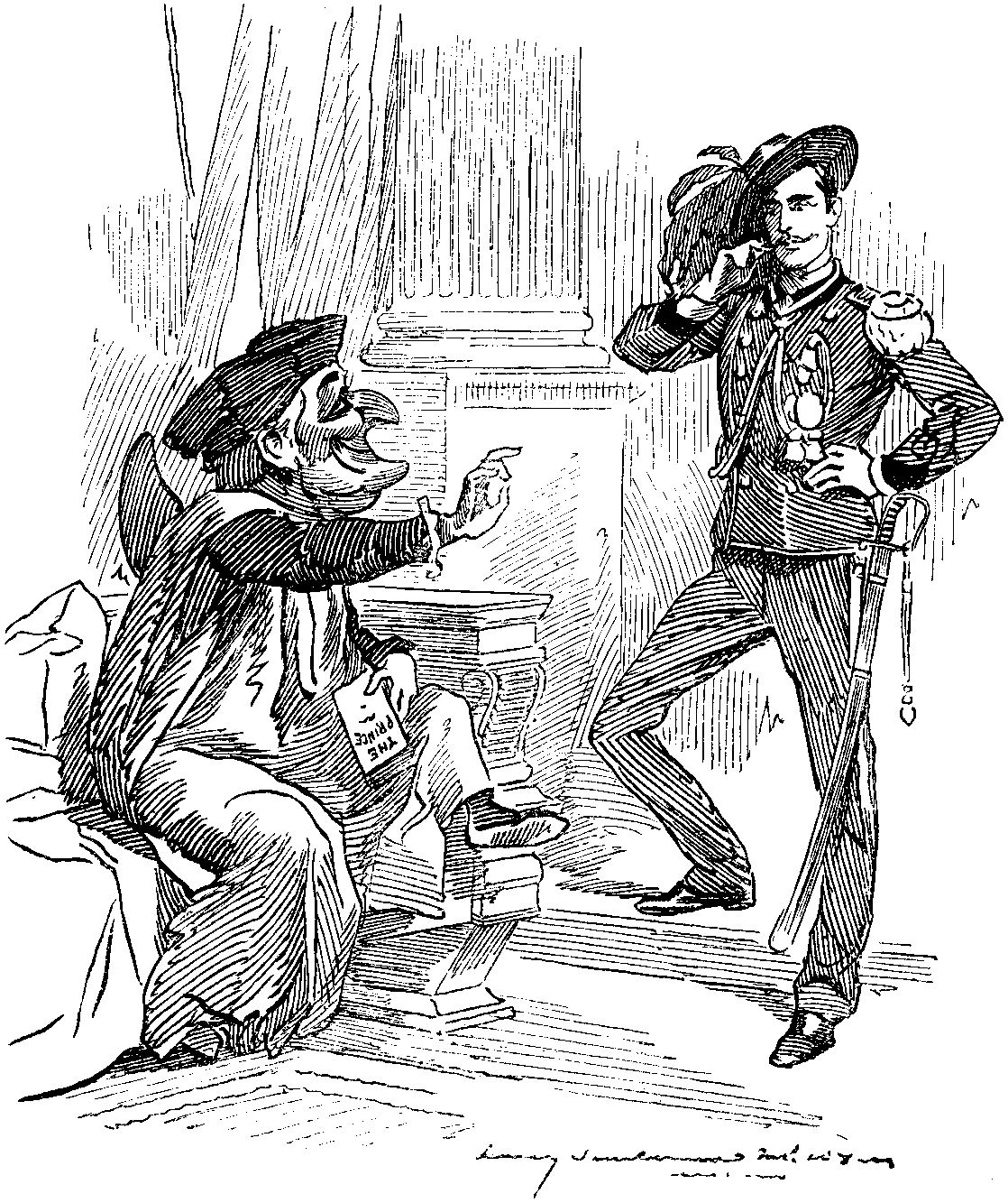 A Prince should have many uniforms, and wear them with much show and glitter. For it is expected of Princes that before they be weaned they should be Colonels, and should rank as Field-Marshals at a time when other lads still trail themselves to school. It is not indeed related of CÆSAR that he drilled a regiment at the age of six, nor of HANNIBAL that being yet a boy he did aught but take an oath. Yet now the custom of the world is otherwise, and a Prince who should never shine in the array of a soldier might justly be held odious and contemptible. That very German Emperor of whom I have spoken, won the applause of the multitude by cuirass and helmet, and having donned a British Admiral's uniform, was held of great account amongst a people apt for the rule of the sea. This honour in truth falls not to all; but others, and yourself among the number, may be made Post Captains, and wear a naval dress both with comfort and approbation.
