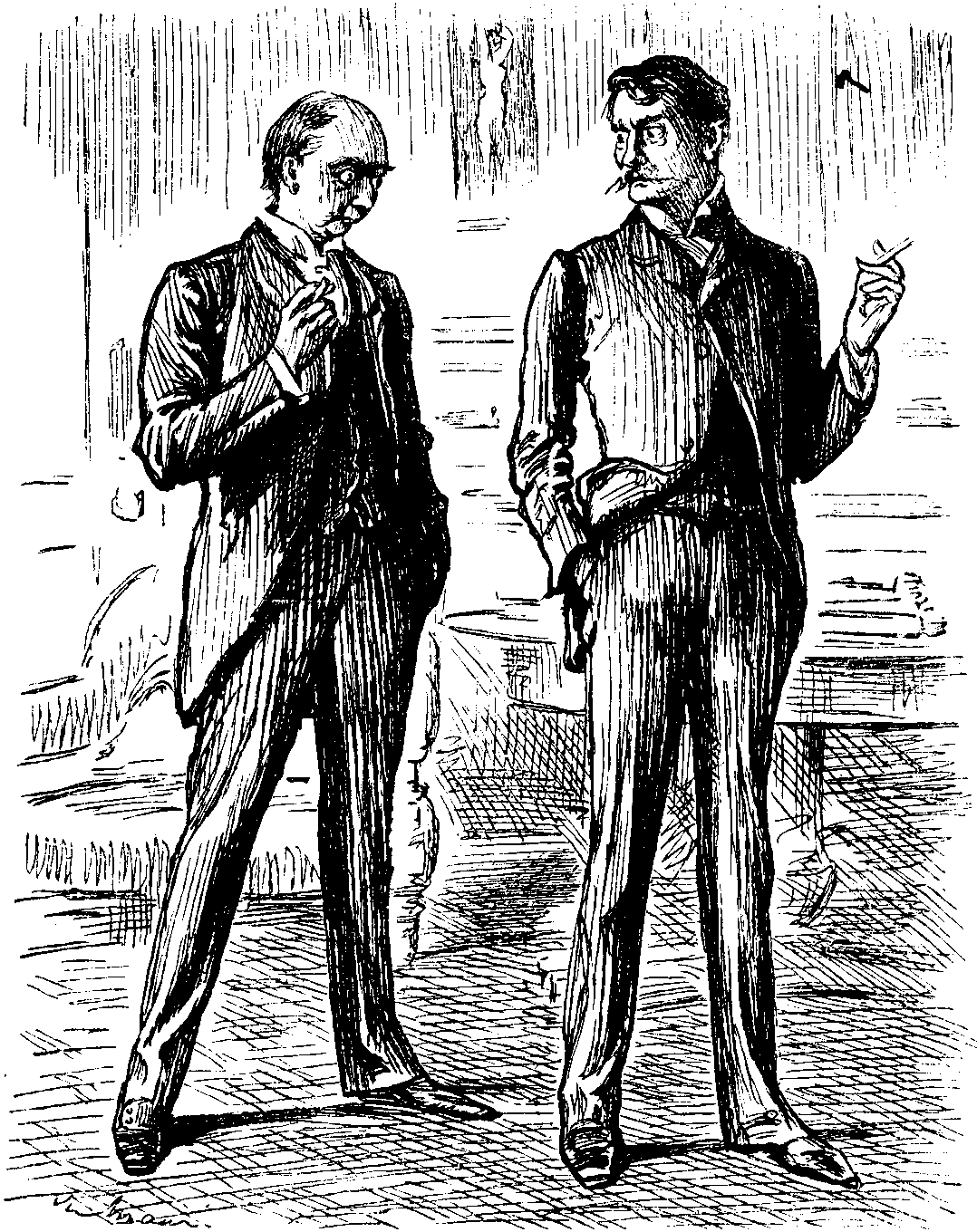 Certainly a narrow escape. It was after this that KEAY's patent-leather boots glistened on the floor of House as he walked up to take seat below Gangway. Determined to make up for lost time; led astray in all directions; SPEAKER called him to order with increasing sternness; HENNIKER HEATON asked if he might move that for rest of Session he be no longer heard; SPEAKER evidently sorely tempted; here was a short sure way out of the difficulty. Faltered a moment, then rose heroically to sense of duty; put aside proposal, and KEAY went on again for another half-hour. "A long rigmarole," JOKIM called the speech. This not Parliamentary, but no one objected.