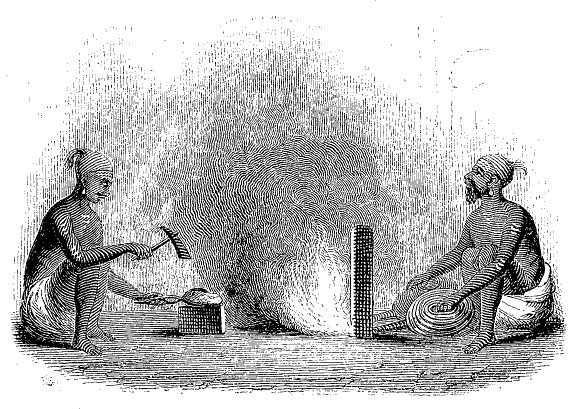 Theirs consist of two leather bags, about a foot wide and a foot and a half long, each having a nozzle at one end. The other end is left open to admit the air. When they wish to blow the fire, they extend these bags to let in the air. They then close them by means of the thumb on one side, and the fingers on the other, and press them down towards the nozzle of the bellows, which forces the air through them into the fire. I should have said before, that the nozzle of the bellows passes through a small semicircular mound of dried mud.