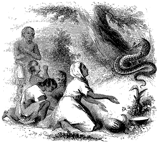 Siva's conduct was very bad. I will tell you but one thing about him. On one occasion he was playing at cards with his wife Parvathe. Vrishnoo was appointed to determine who was the best player. After playing for a little season Parvathe won the game. Siva then beckoned to Vrishnoo to declare that he, instead of Parvathe, had won it. This he did. In consequence of this falsehood, he was cursed by Parvathe, and changed into a snake.