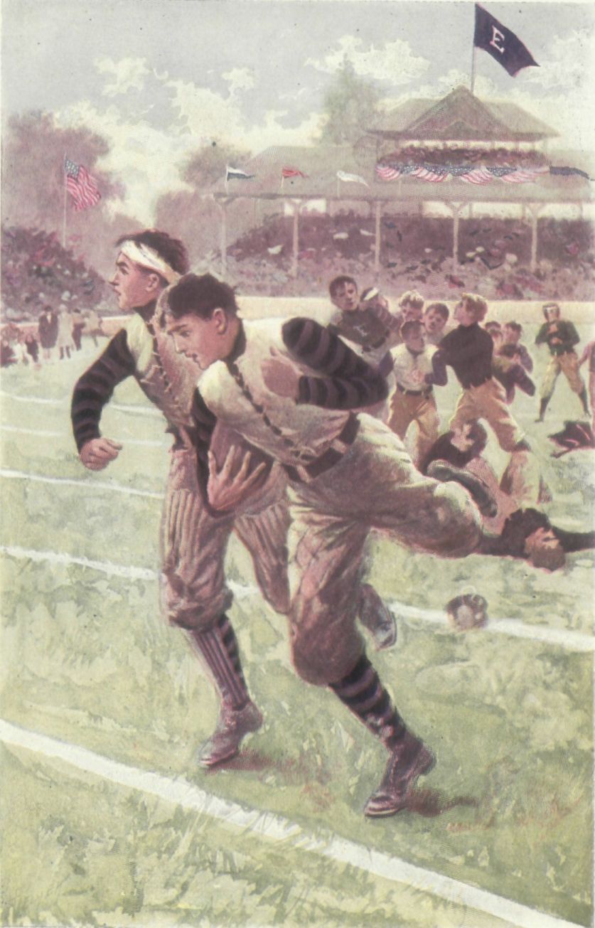 The ball came back into his waiting hands, was thrown at a short pass to the left half, and, with right half showing the way and full-back charging along beside, Fletcher cleared the line through a wide gap outside of St. Eustace's right tackle and sped down the field while the Hillton supporters leaped to their feet and shrieked wildly. The full-back met the St. Eustace right half, and the two were left behind on the turf. Beside Fletcher, a little in advance, ran the Hillton captain and right half-back, Paul Gale. Between them and the goal, now forty yards away, only the St. Eustace quarter remained, but behind them came pounding footsteps that sounded dangerous.