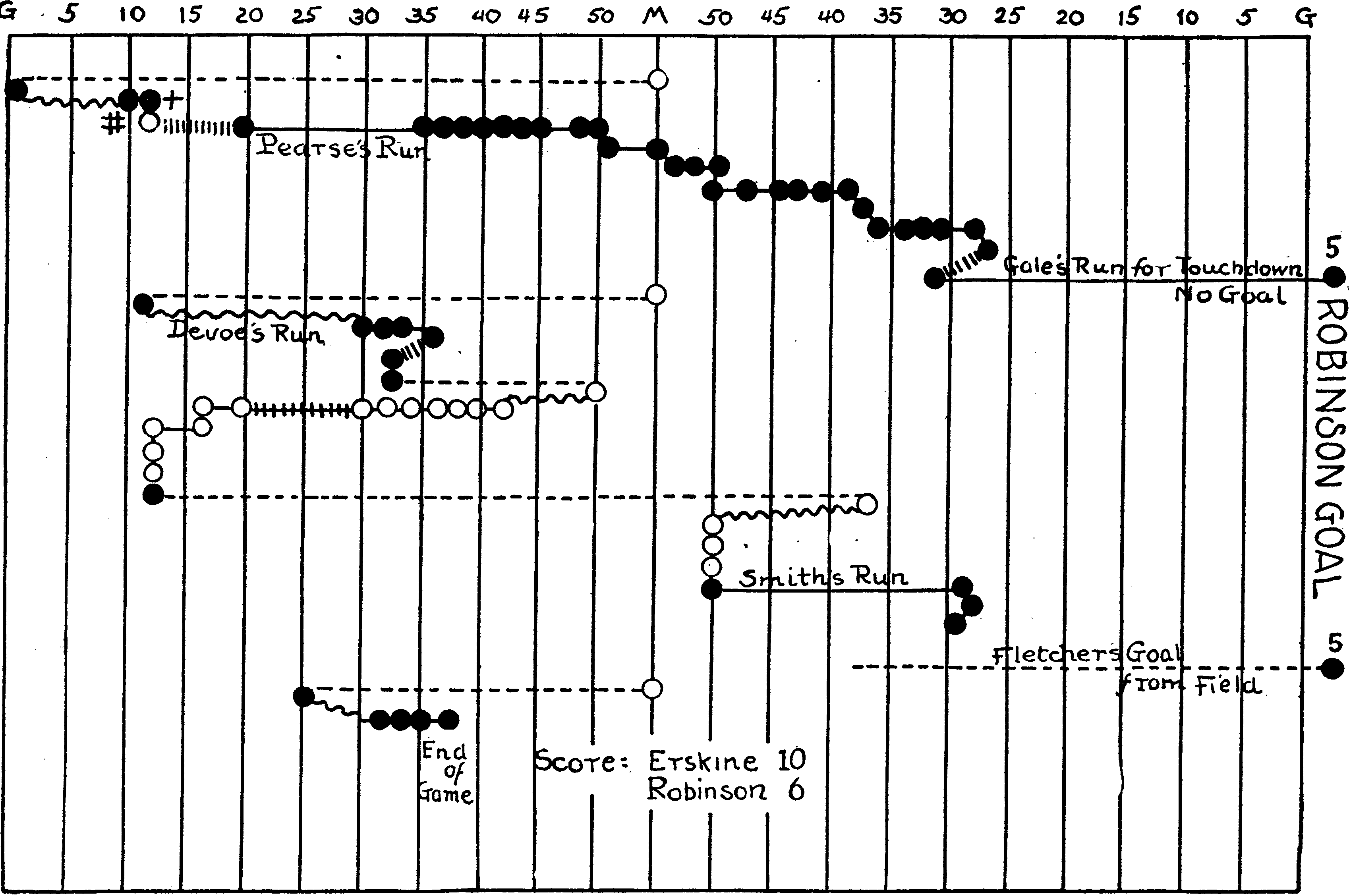 A try by Neil outside of right tackle netted but a yard and left him half fainting on the ground. Pearse set off for the left end of the line on the next play, but never reached it; the Robinson right tackle got through on to him and stopped him well back of his line.