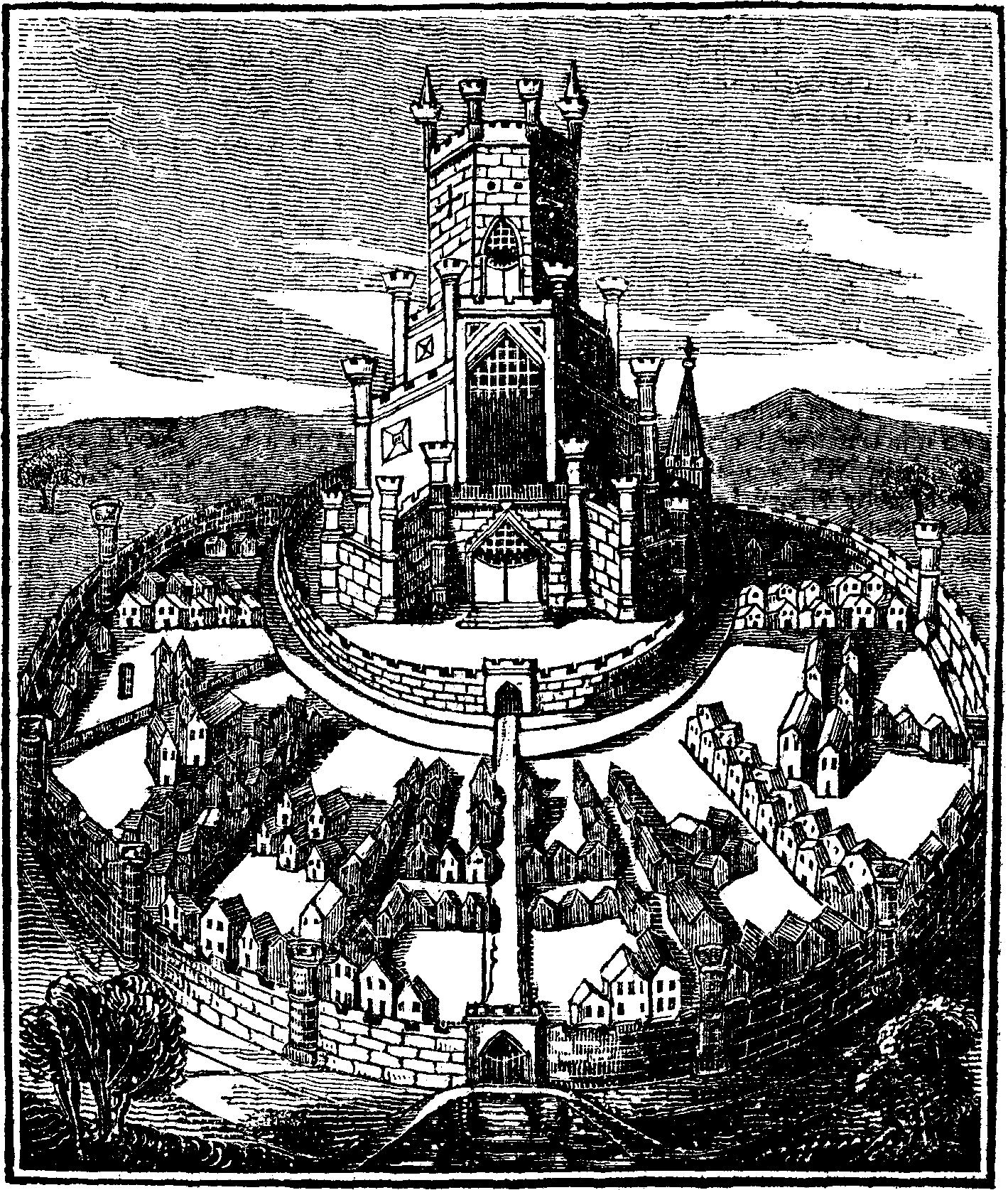 The space occupied by the ancient city is stated to have been nearly 2,000 feet in diameter, surrounded with a fosse, or ditch, of immense depth, and two ramparts, inner and outer: on the inner, which was much higher than the outer, stood a wall nearly 12 feet thick at its foundation, of flint and chalk, strongly cemented together, and cased with hewn stone, on which was a parapet with battlements. In the centre, on the summit of the hill, stood the castle or citadel, surrounded with a very deep intrenchment and a high rampart; and in the area beneath, forming a wide space between the inner and outer ramparts, stood the city, divided into equal parts, north and south; near the middle of each division was a gate—these two being the grand entrances, with a tower and mole over and before each. Besides these were ten other towers, at equal distances round the city; and opposite them, in a straight line with the castle, were built the principal streets, intersected in the middle with one grand circular street, encompassing the whole city. In the angle to the north-west stood the cathedral, and episcopal palace, and the houses of the clergy.