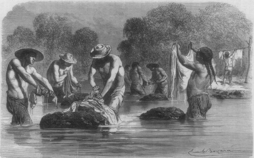 The first hours of morning were consecrated to a general examination of the stores, especially the precious specimens of cinchona. Bundles were restrapped, the damp provisions laid out in the sun, and the clothing of the party, even to the most intimate garment, was taken down to the river to be refreshed and furbished up. A common disaster had created a common cause amongst the whole troop, and with one accord everybody—peons, mozos, interpreters, bark-strippers and gentlemen—set in motion a grand cleaning-up day. Napoleon-like, they washed their dirty linen in the family. Whoever had seen the strangers coming and going from the beach to the woods, clothed in most abbreviated fashion, and seeming as familiar to the uniform as if they had always worn it under the charitable mantle of the woods, would have taken them for a savage tribe in the midst of its encampment. It is probable they were so seen.