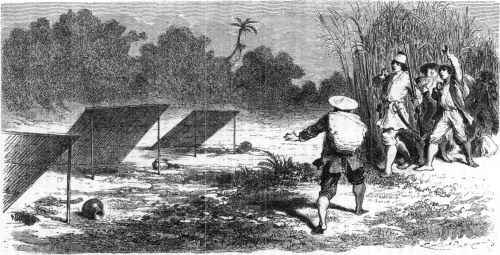 Thanks to the intense heat of the sun-shine, the garments and baggage of the expedition were quickly dried. The first were donned, the last was loaded on the porters, and the line of march was taken up. Up to noon the road lay along the blazing sands under a sun of fire. All the members of the party felt fresh and hardy after the involuntary bath, except one of the Indians, who was affected with a kind of ophthalmia. This attack, which Mr. Marcoy attributed partly to the glare, partly to the wet, and partly to a singular hobby peculiar to the individual of sleeping with his eyes wide open, was of no long duration. The pain which he complained of disappeared with a few hours of exercise and with the determination he showed in staring straight at the god of day, who, as if in memory of the worship formerly extended toward him in the country, deigned to serve as oculist for the sufferer. A little before sunset halt was made for the night-camp in the centre of a beach protected by clumps of reeds in three quarters of the wind. The Indian porters, despatched for fish and firewood, returned suddenly with a frightened mien to say that they had fallen into the midst of a camp of savages. The white men quickly rejoined them at the spot indicated, where they found a single hut in ruins, made of reeds which appeared to have been cut for the construction some fortnight before, and strewn with fire-brands, banana skins and the tail of a large fish. Pepe Garcia, consulted on these indications, explained that it was in reality the camping-place of some of the savage Siriniris, but that the narrowness of the hut seemed to indicate that not more than two of the Indians, probably a man and woman, had resided there during a short fishing-excursion.